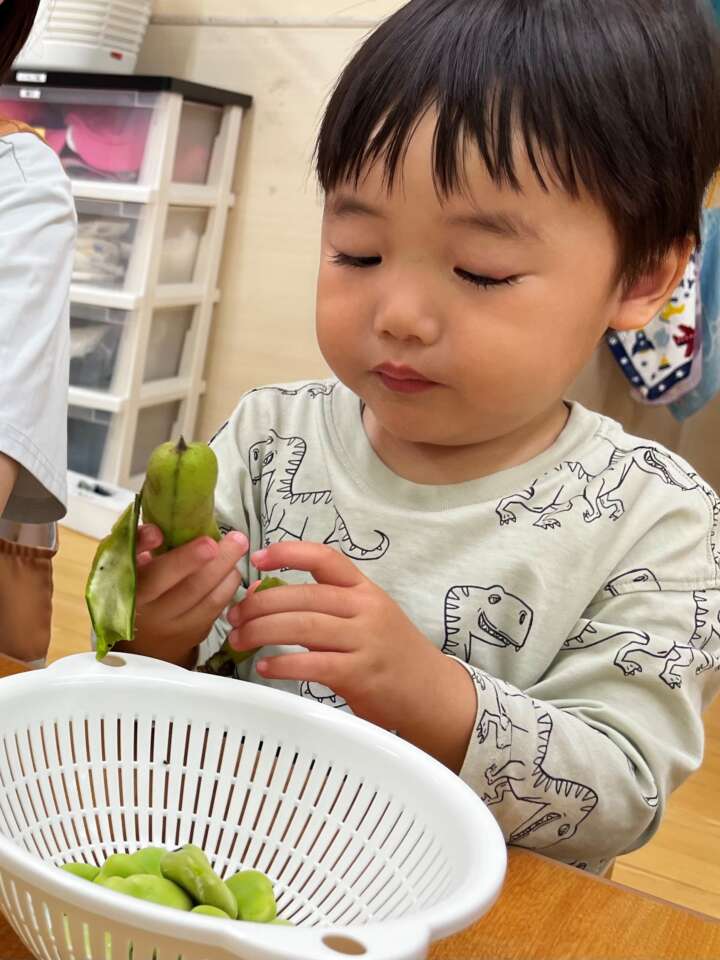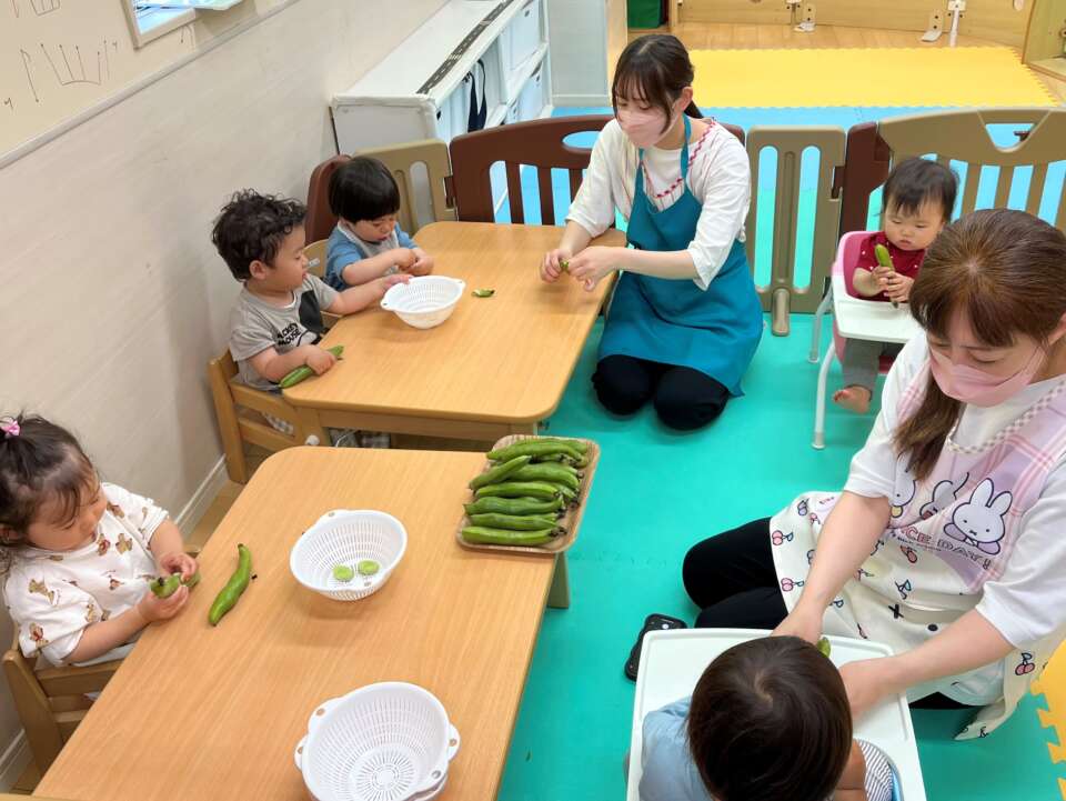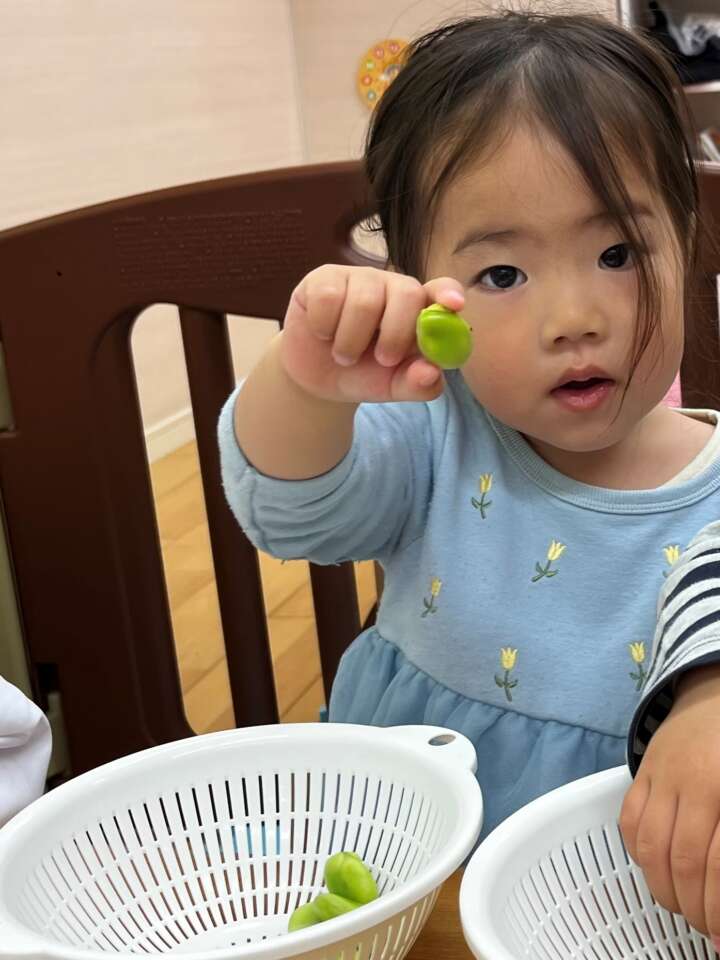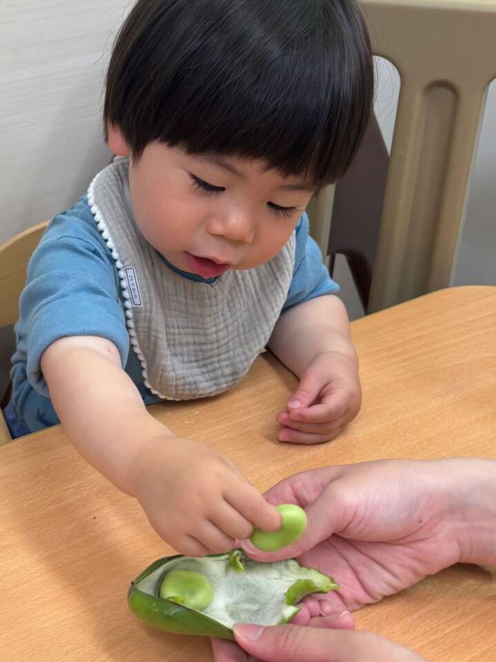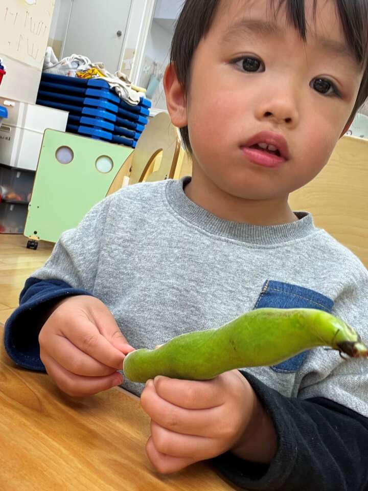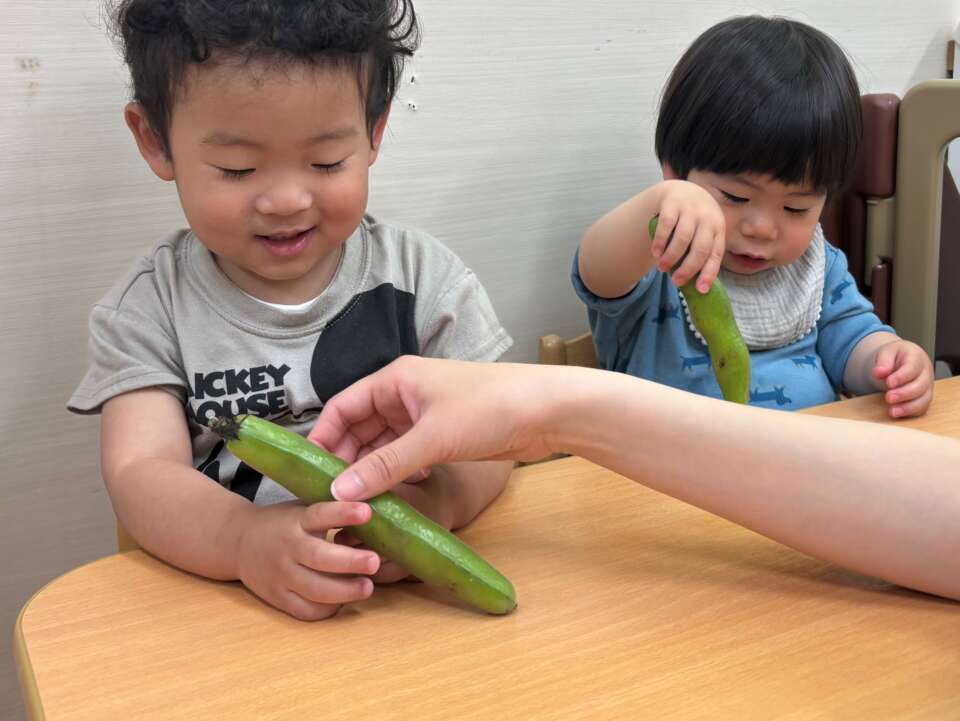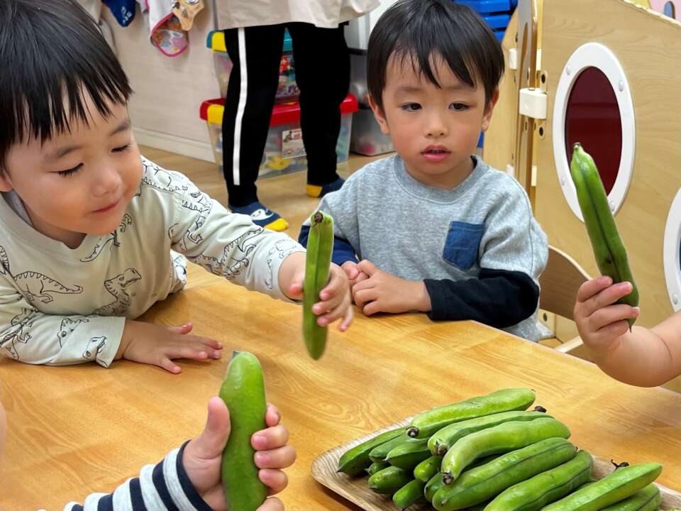 先生と「そらまめ何個入っているかな~」と当てっこをしながら、そらまめのさやむきを楽しみました♪