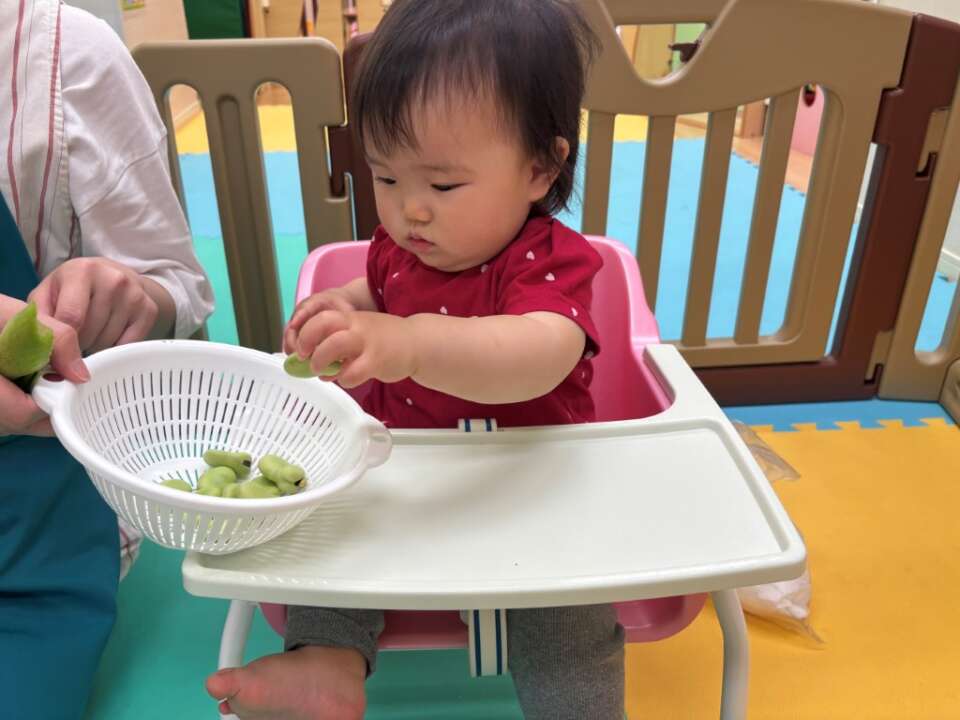 手に持ってみるとテーブルにトントンしてみたり、そらまめを観察していました。