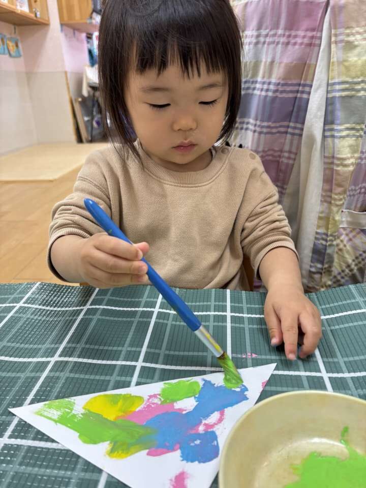 筆を使って絵の具で画用紙半分にいろいろな色をぺたぺた♪