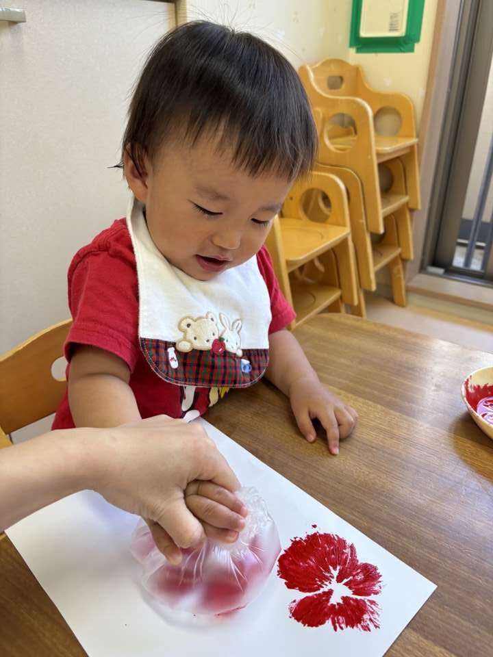 膨らませたビニール袋に絵の具を付けて、先生と一緒にぺたぺた♪