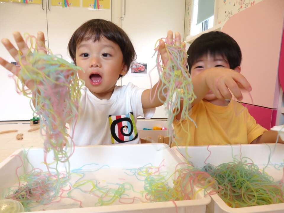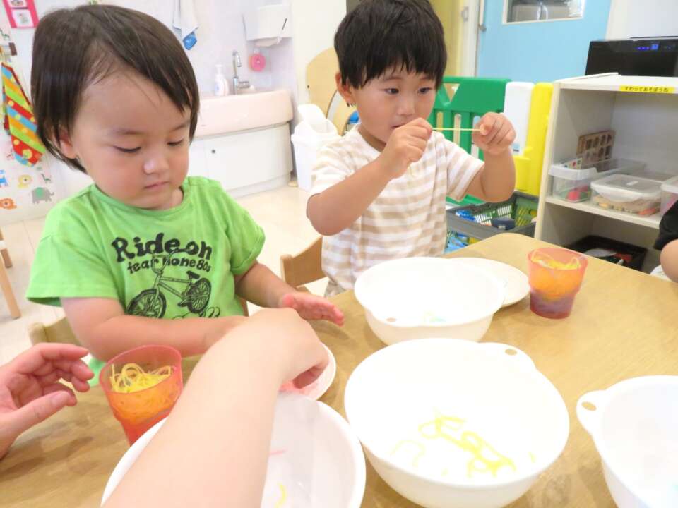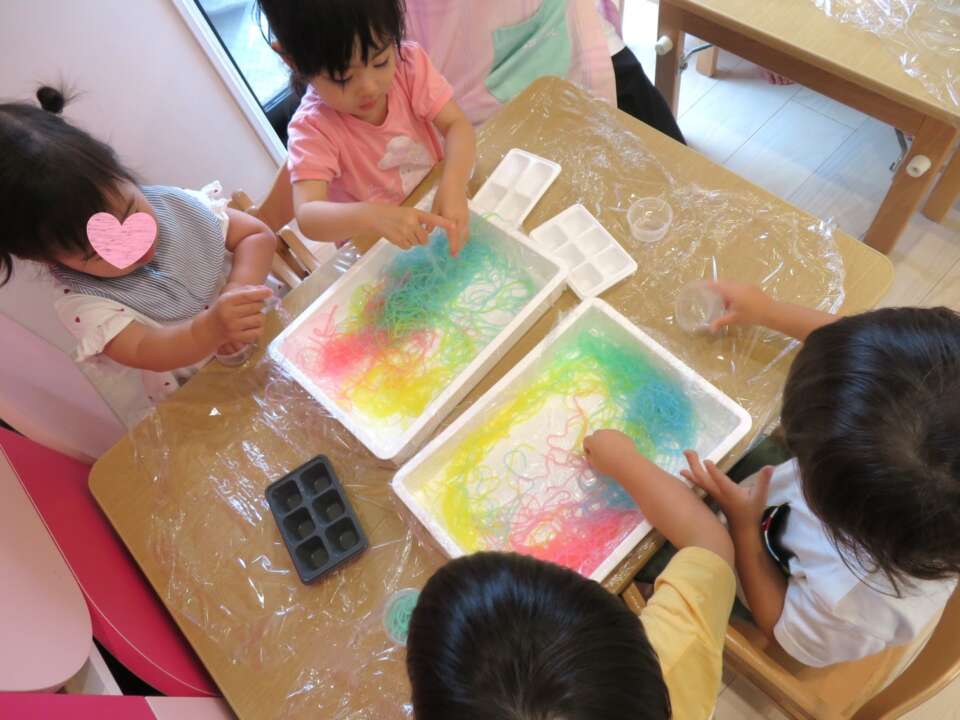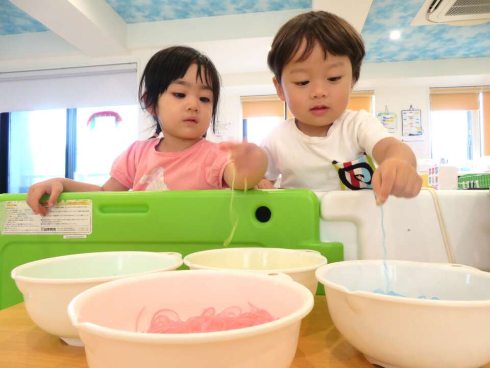 カラフルな春雨を用意すると、「なんだなんだ?😶」と興味津々な子ども達が集まってきました!