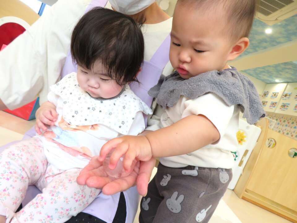 0歳児クラスさんは、水風船と氷遊びに挑戦!