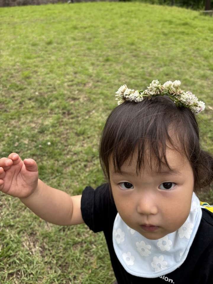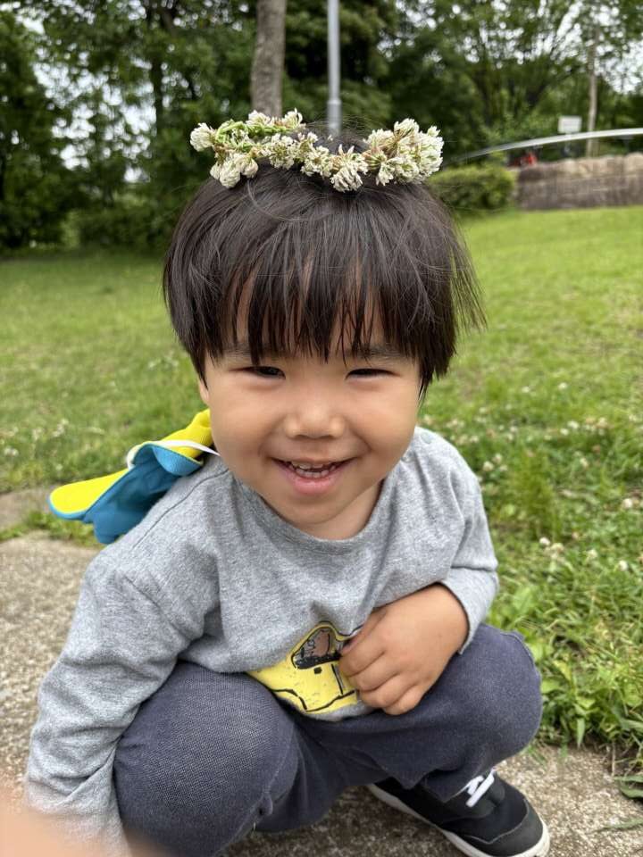6月の戸外遊びの時に、シロツメクサで保育士がかんむりを作成!