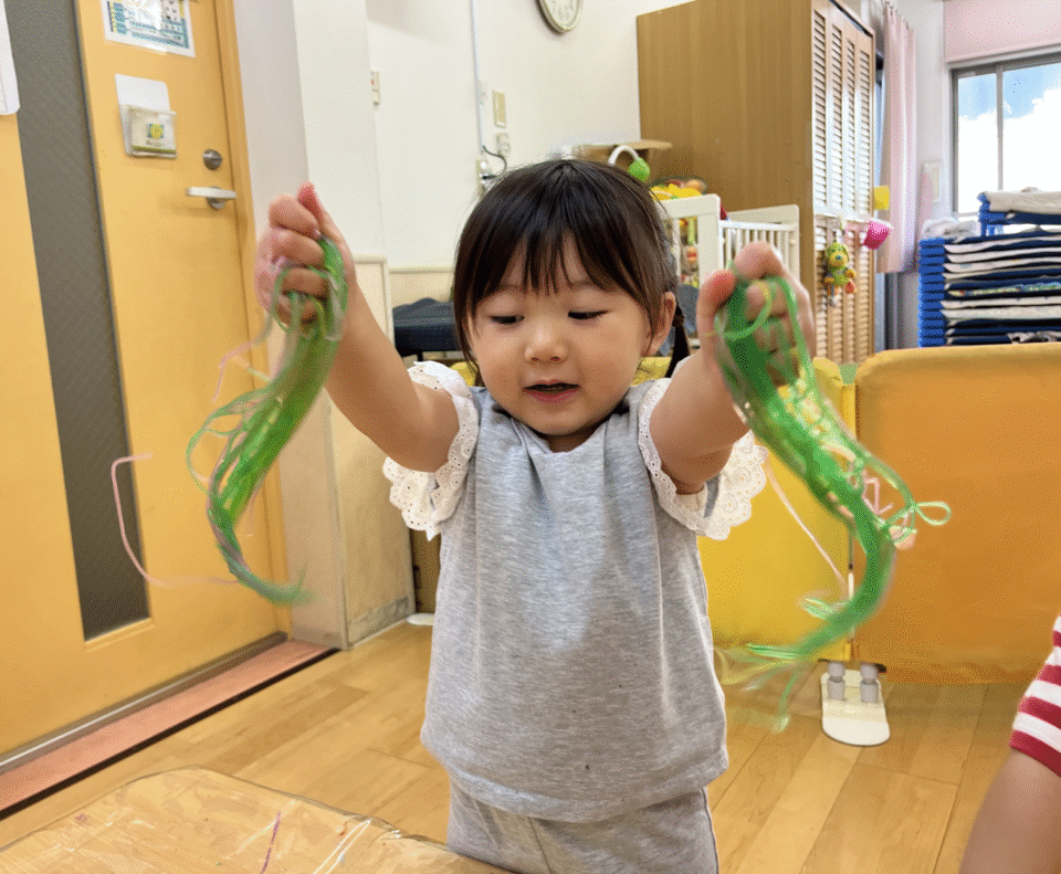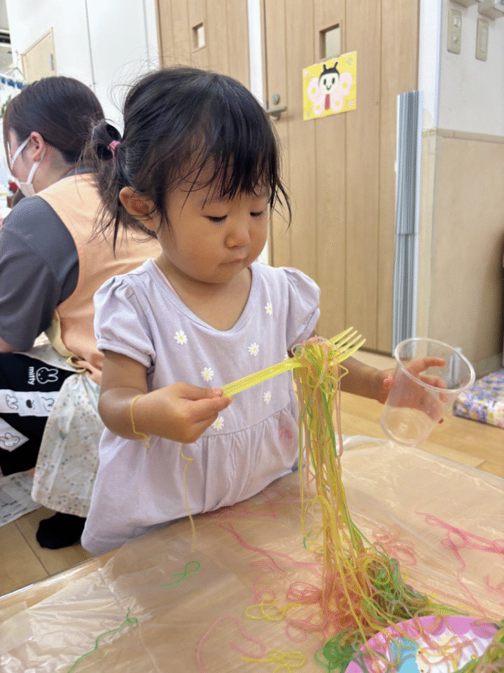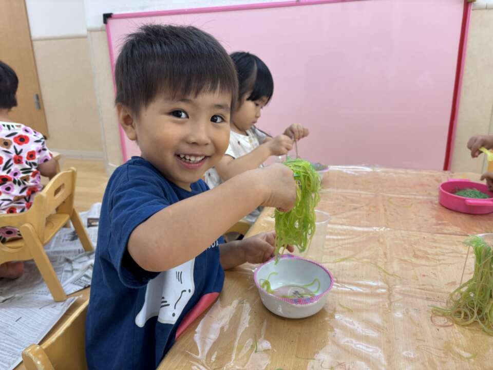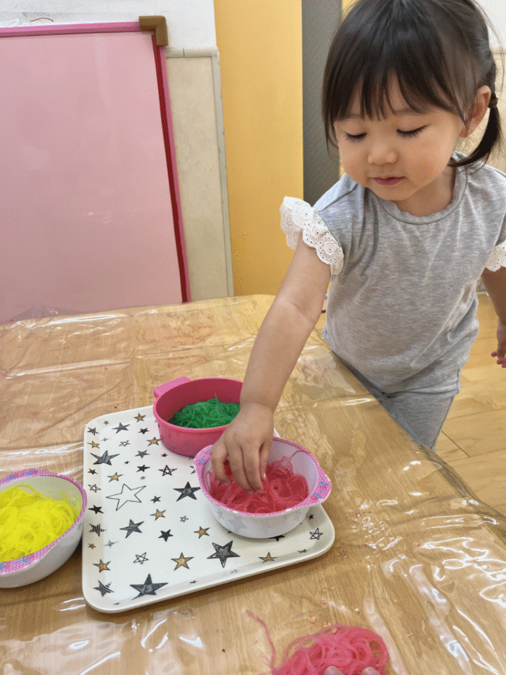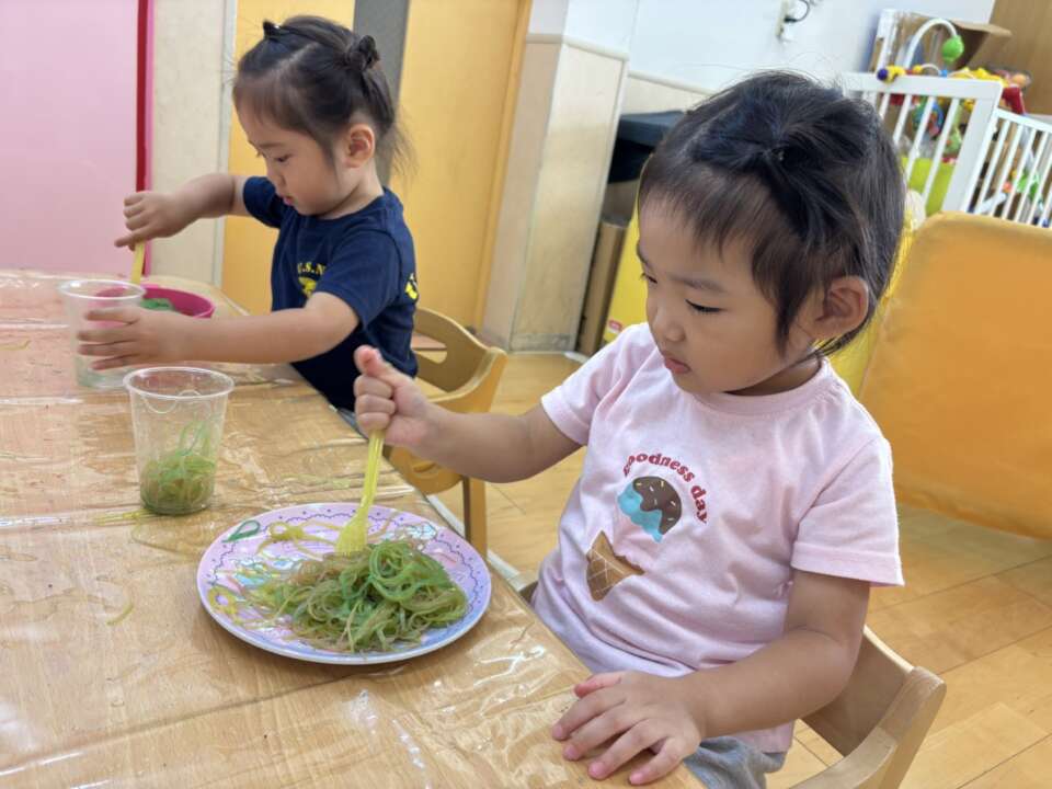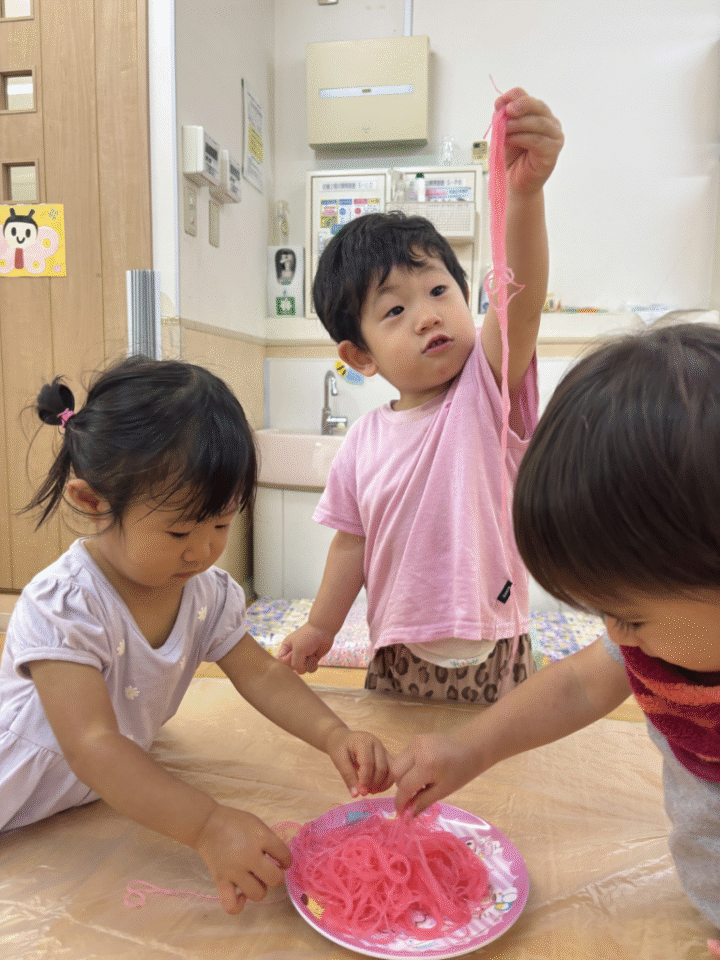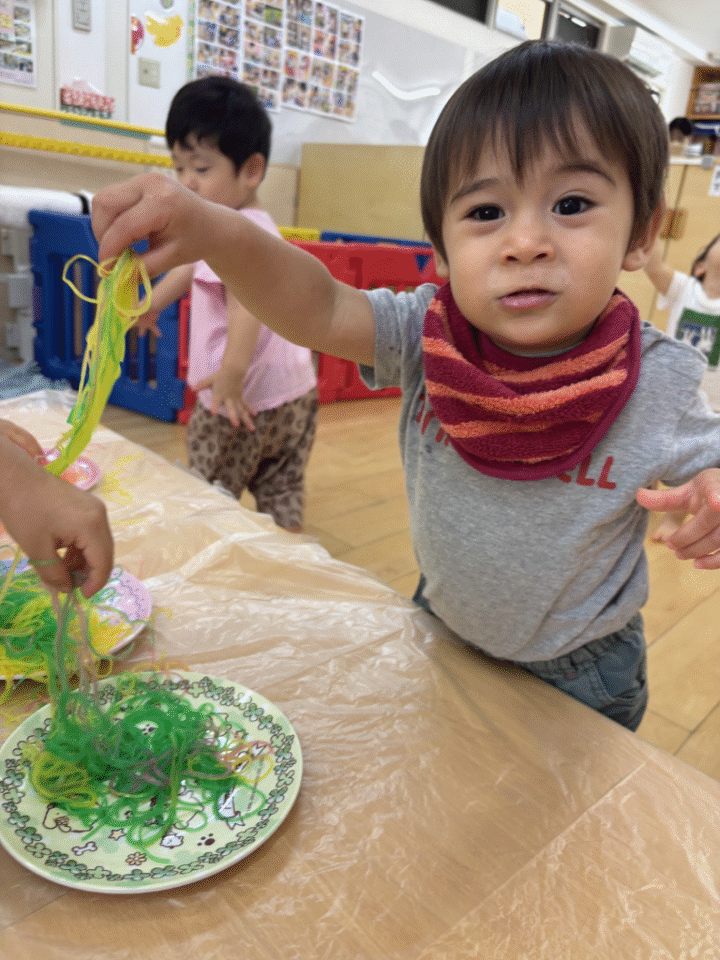 今回は先日遊んだ1歳児、2歳児の春雨遊びと0歳児の氷遊びをご紹介します☺