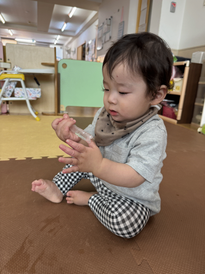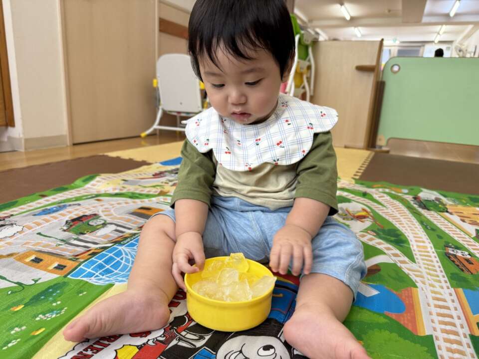 暑い日が続き、お散歩に行けない日が続いていますが、水遊びやおもちゃ、感触遊びなどをして過ごしています!