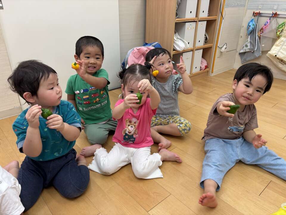 すいか組(2歳児)が育てていたピーマン・パプリカ・なすも7.8.9月に無事に実をならし、何度か収穫も楽しむことができました!!