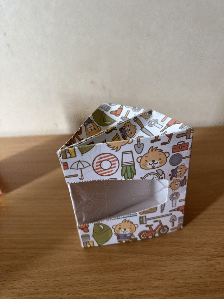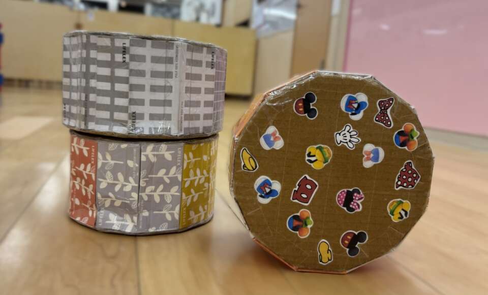 ④段ボールの面に好きなキャラクターや模様をつけて完成!