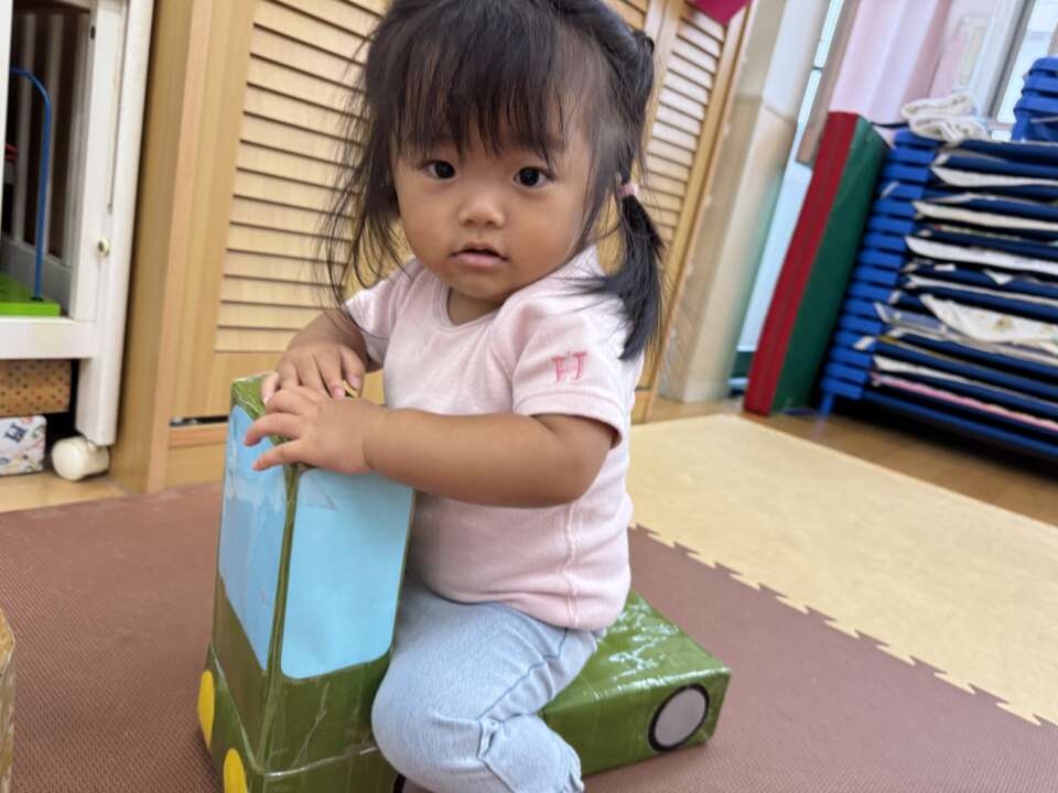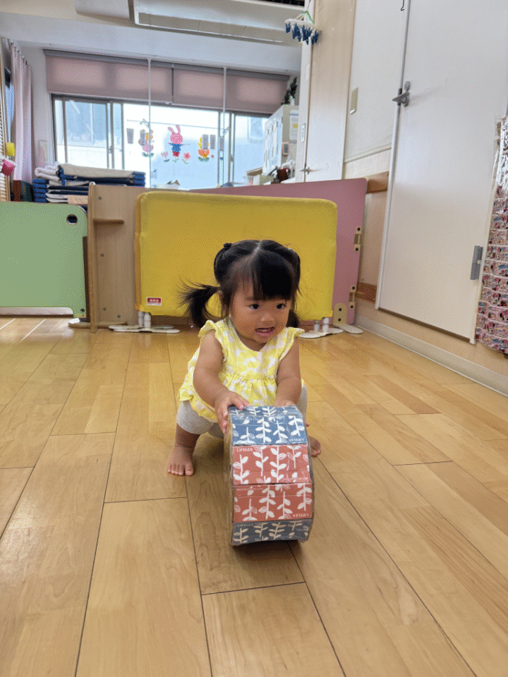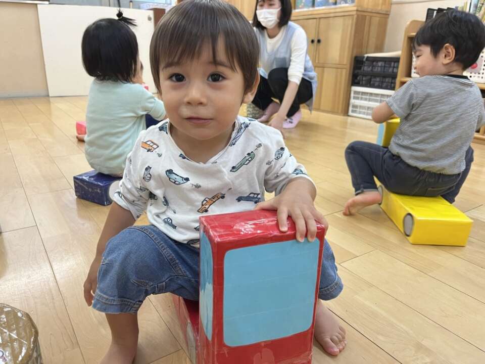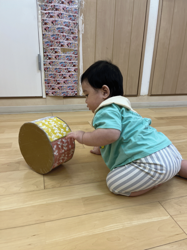 丸い台を重ねてみたり、コロコロ~と転がし追いかけて遊んだりもします。