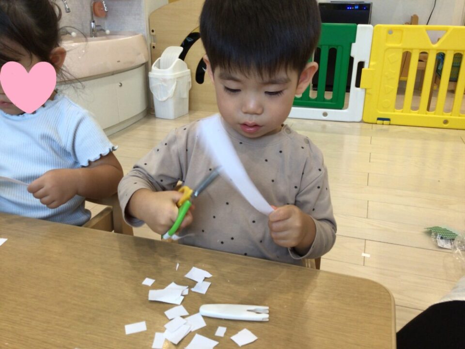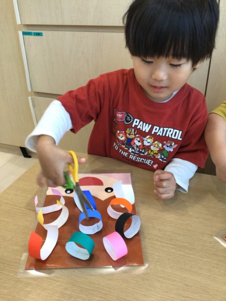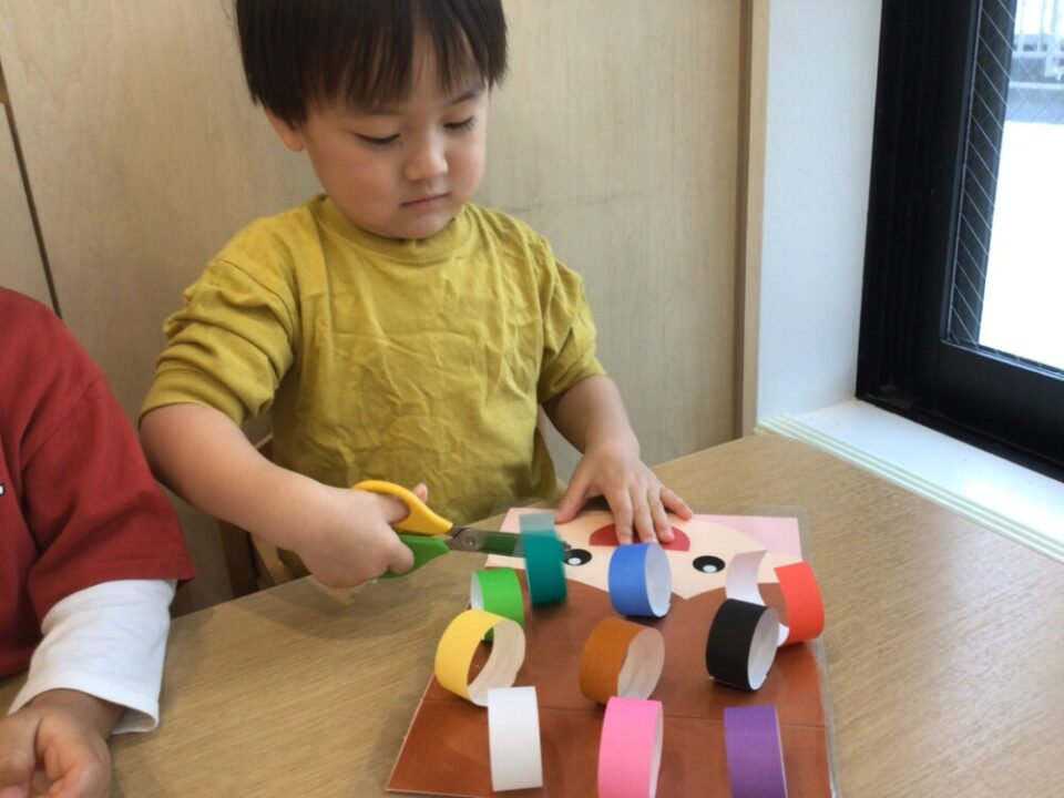 また色とりどりの輪っかを切る時には「どの色にしようかな~?」と悩みながら楽しむ様子も✨