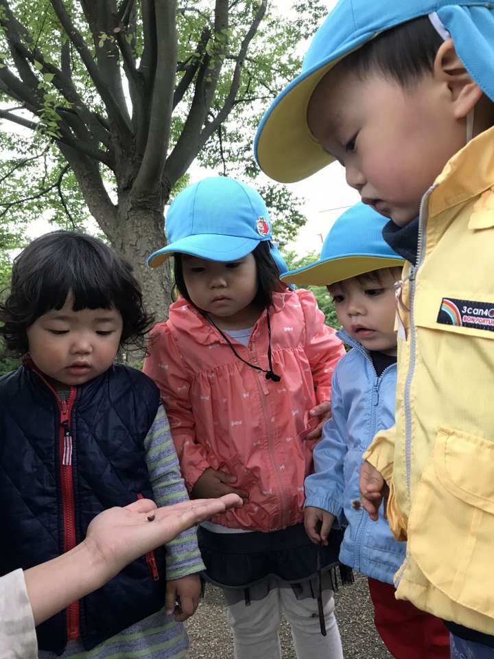 先生の手の上にダンゴ虫・・みんな興味はあるけど触れないなぁ・・