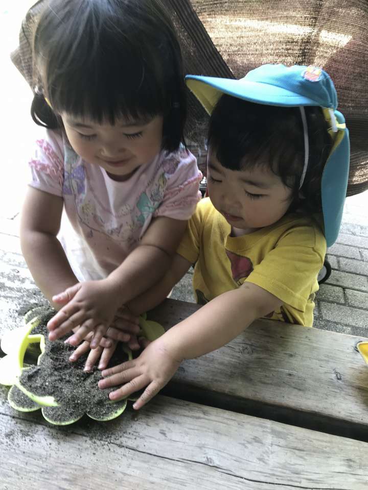 一緒に砂を混ぜ混ぜ。何ができるかな?!