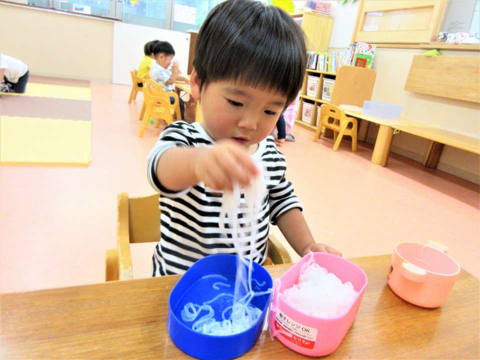 いつもは食べ物で遊ぶなんてダメだけど、この日は白滝を使った感触遊びをやってみました🎵