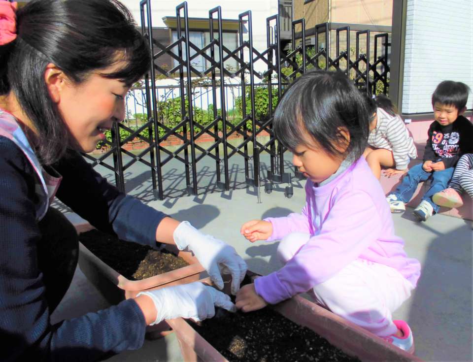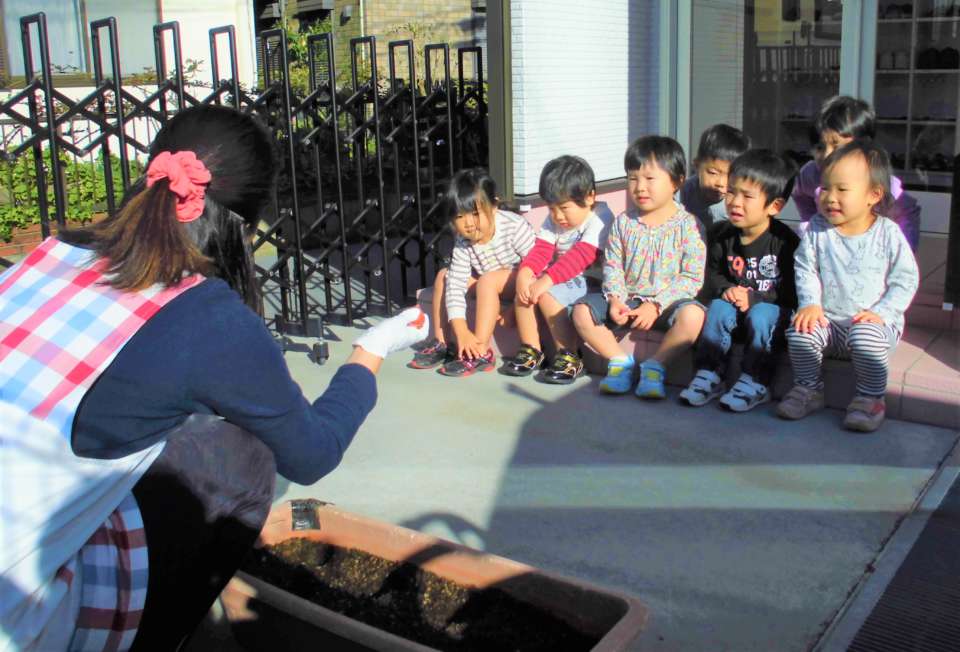 秋晴れの気持ち良い日差しの中、2歳児さんでチューリップの球根を植えました🌷