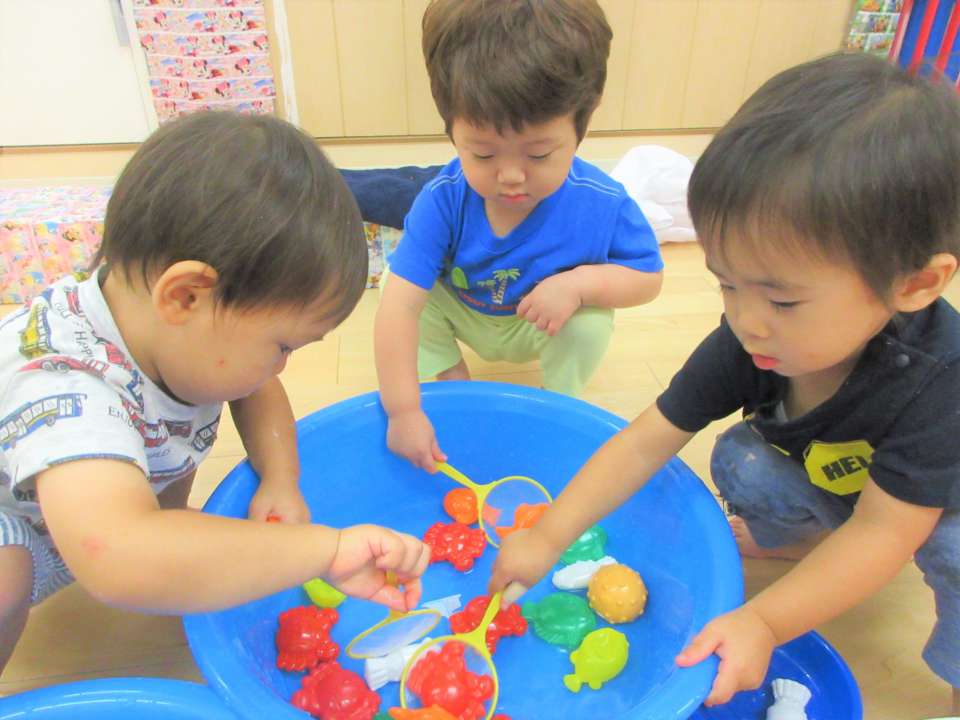 雨の日はお部屋でも水遊びをしました。たくさんすくえるかな~?✨