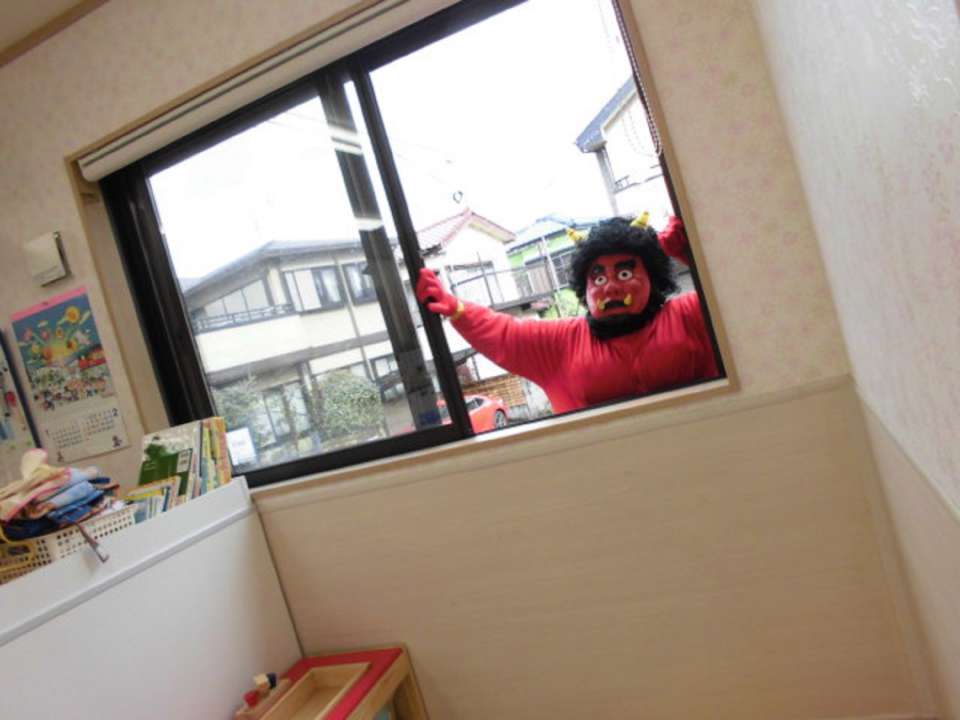 窓の外に鬼がーーー!!みんなビックリ。お部屋の隅に逃げる子、先生に抱き着く子、動きが止まる子、、、と反応はそれぞれ。
