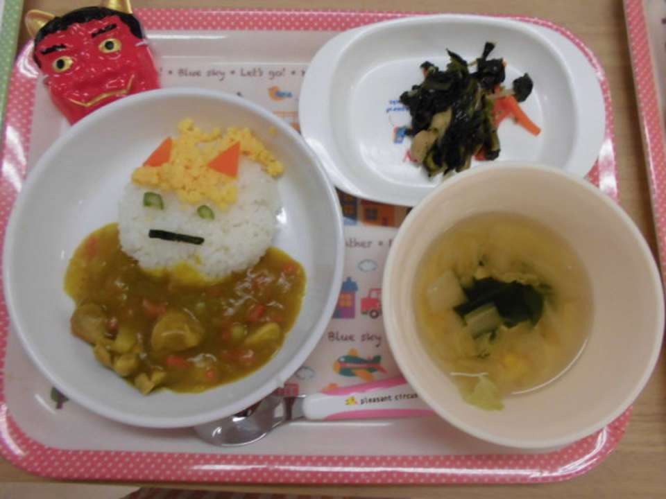 今日は給食の中にも鬼が。こっちの鬼は小さくてかわいいね。美味しくて完食続出でーす。