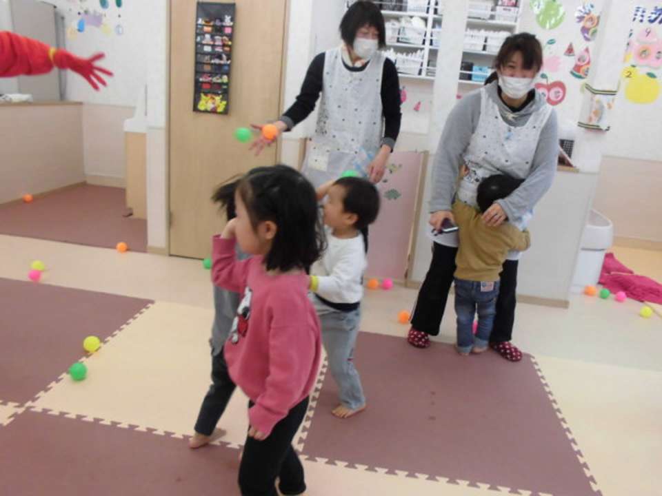 そんな中、怖がりながらも果敢に鬼を退治してくれるお兄さんお姉さんたち。『おには~そと~』『おには~そと~』と必死でボールを投げて鬼をやっつけてくれました。頼りになります!!おかげで鬼を退治することができました。よかったね~