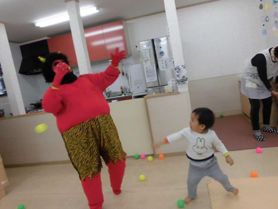 『おには~そと~』の練習。壁に貼ってある鬼にボールを投げる練習をしていると・・・。
