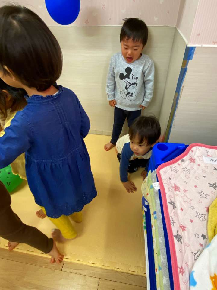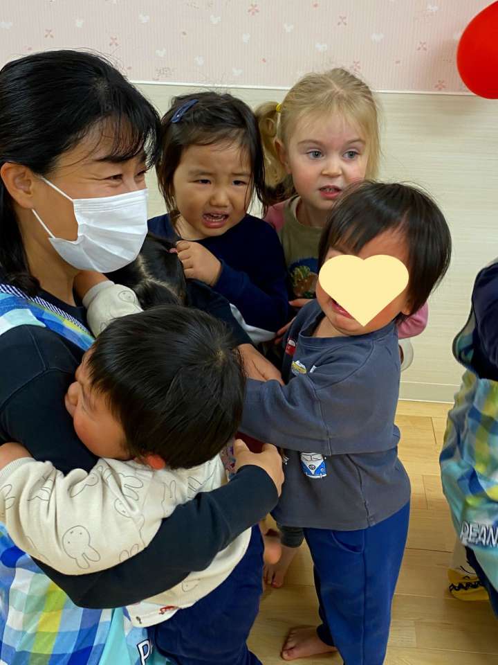 頑張ってボールの豆を投げる子、すぐに先生のところへ逃げ込む子、泣き出してしまう子、陰に身を潜める子、最後まで耐えて泣かない子、様々な様子のこどもたち。