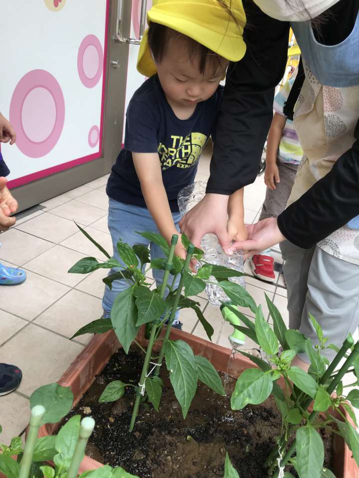 いよいよ収穫・・・ 立派なピーマンができました!!「ピーマン採れたよ!」とみんなうれしそう♪採れたピーマンは給食に入れてもらいおいしく食べました🍴