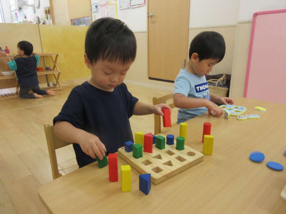 「これはどうやって遊ぶのかな」「こうやって遊んでみよう!」気になった教材を手に取って遊び方を考えながらとても集中して遊んでいました!