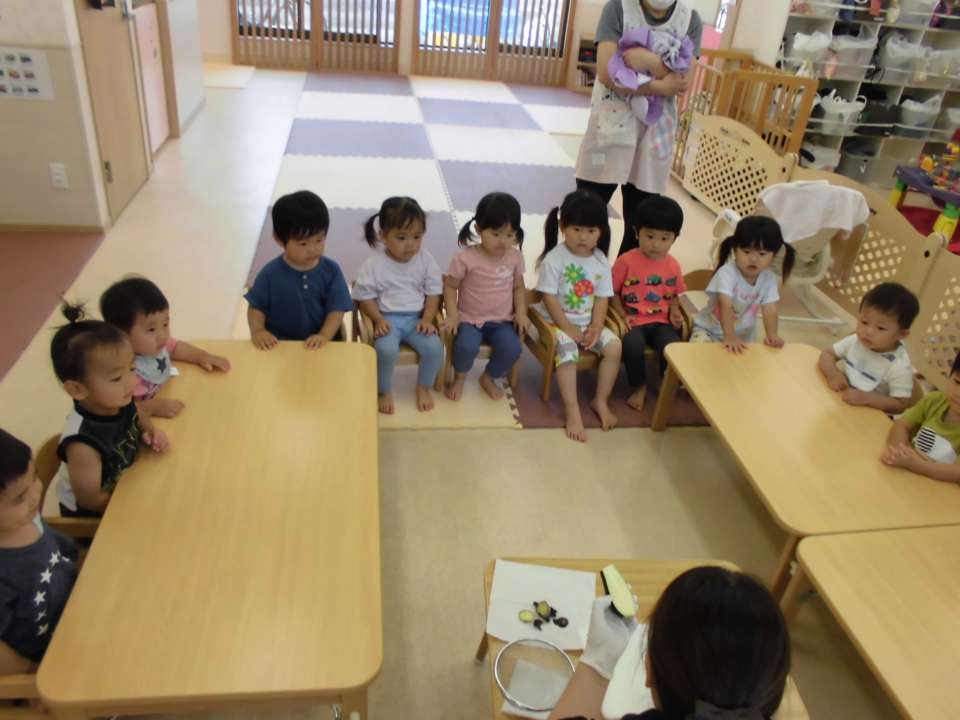今年はミニトマトをナスを植えました。その中のナスがひとつだけぐんぐん大きくなりあっという間に収穫。みんなの前で切って和えて一口ずつ食べました。まだまだ収穫できそうで楽しみです。