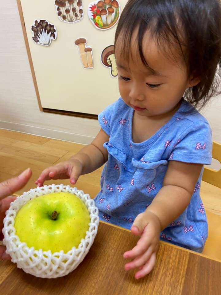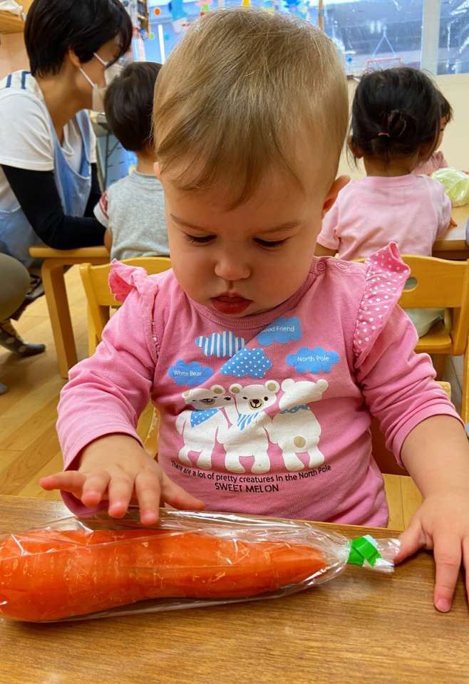 朝の野菜紹介の時に野菜や果物に触れてみました