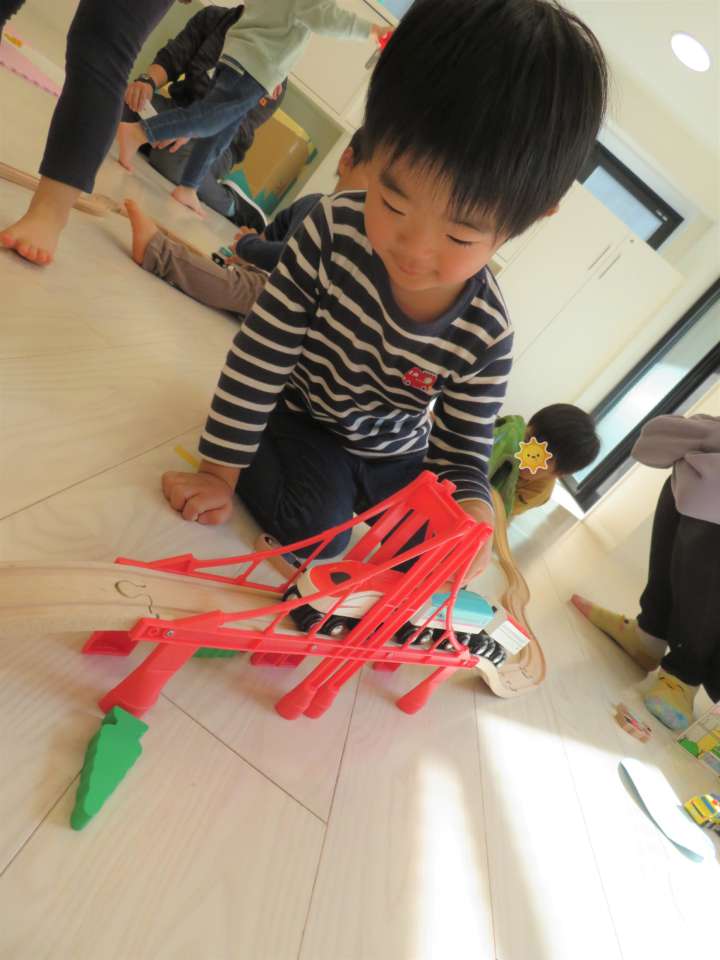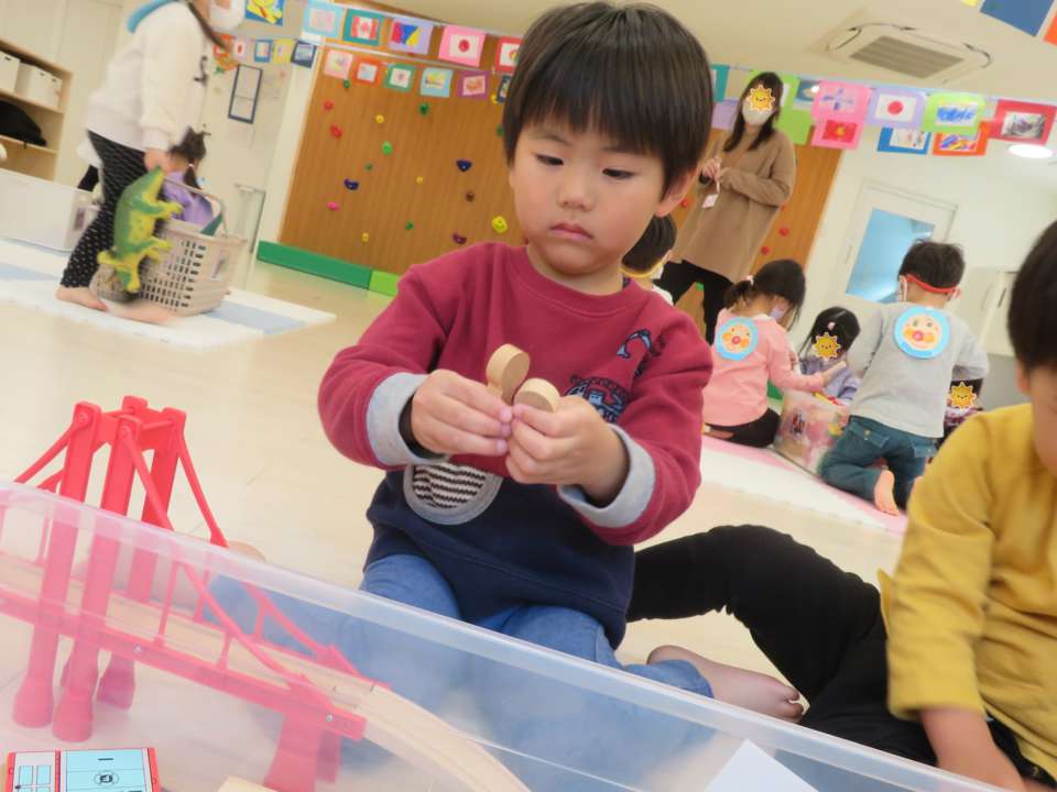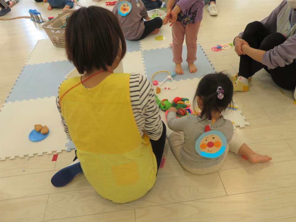 自由遊びの後には、季節の手遊びとラーメン体操を行い、いつの間にかお兄さんお姉さんと手を繋いで活動を楽しんでいました✨