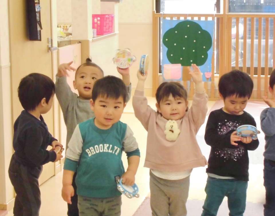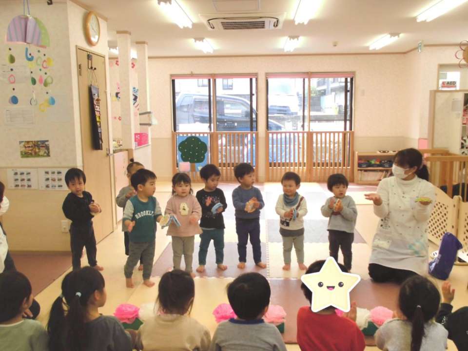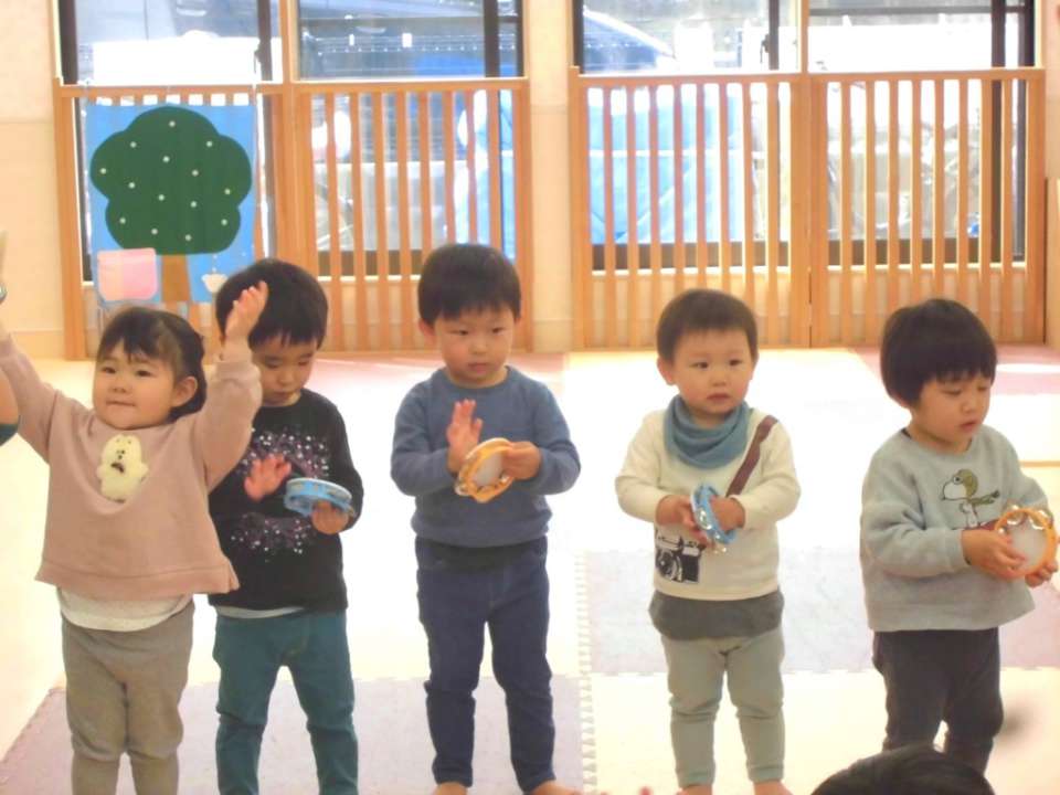 タンバリンを持って「おもちゃのチャチャチャ 」の歌を歌いました。お部屋にいる全員で声をそろえて歌えて楽しかったです 🎶