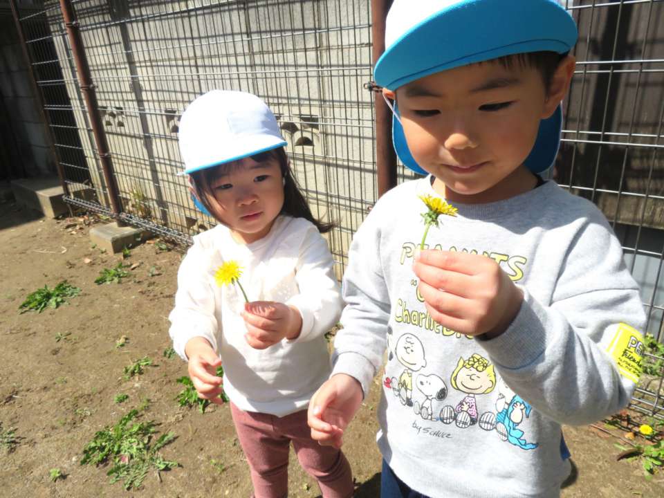 たんぽぽにフーっと息をかけて、「飛ばないね」と話し合っていました。
