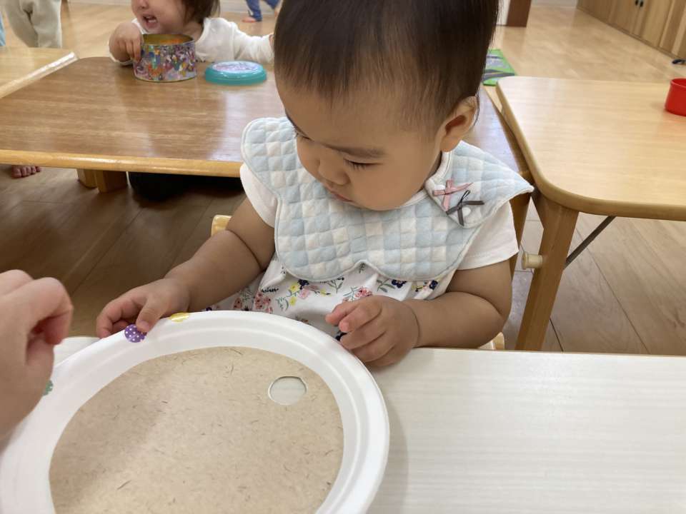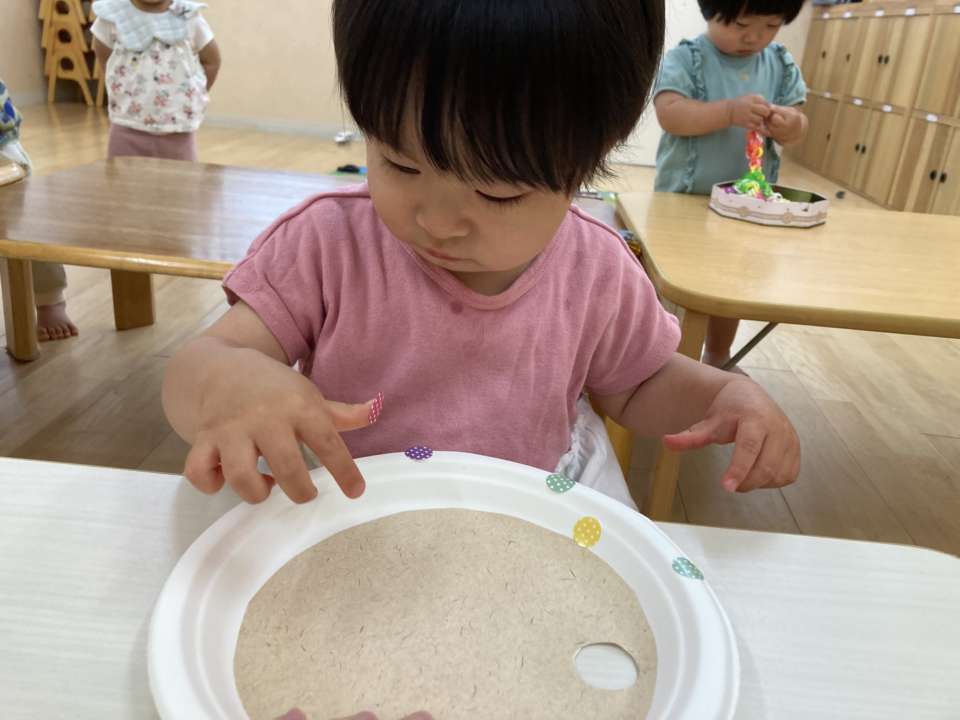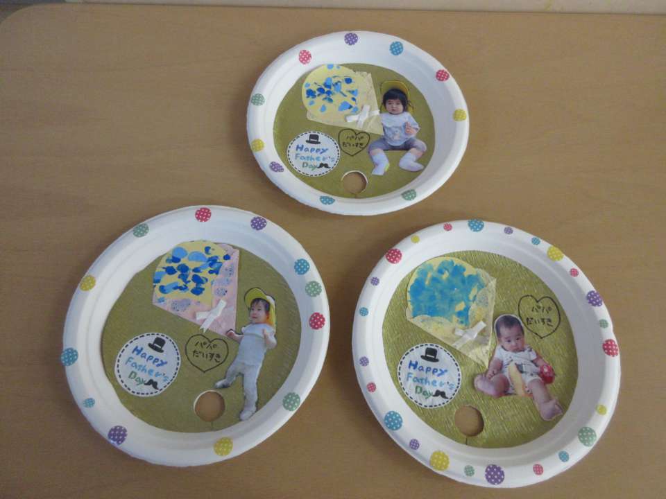 父の日の製作では紙皿にシールを貼り、そこに指スタンプの花束を添えてうちわを作りました!