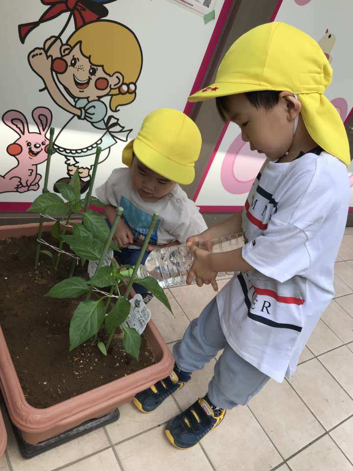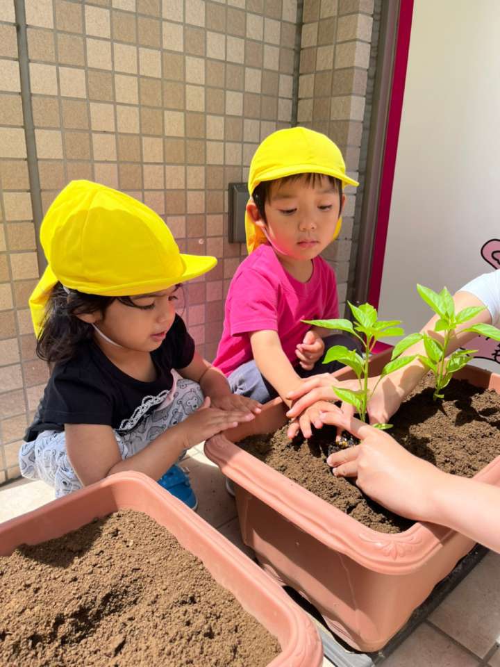 うさぎ組さんは6月のはじめにピーマンの苗を植えました♪