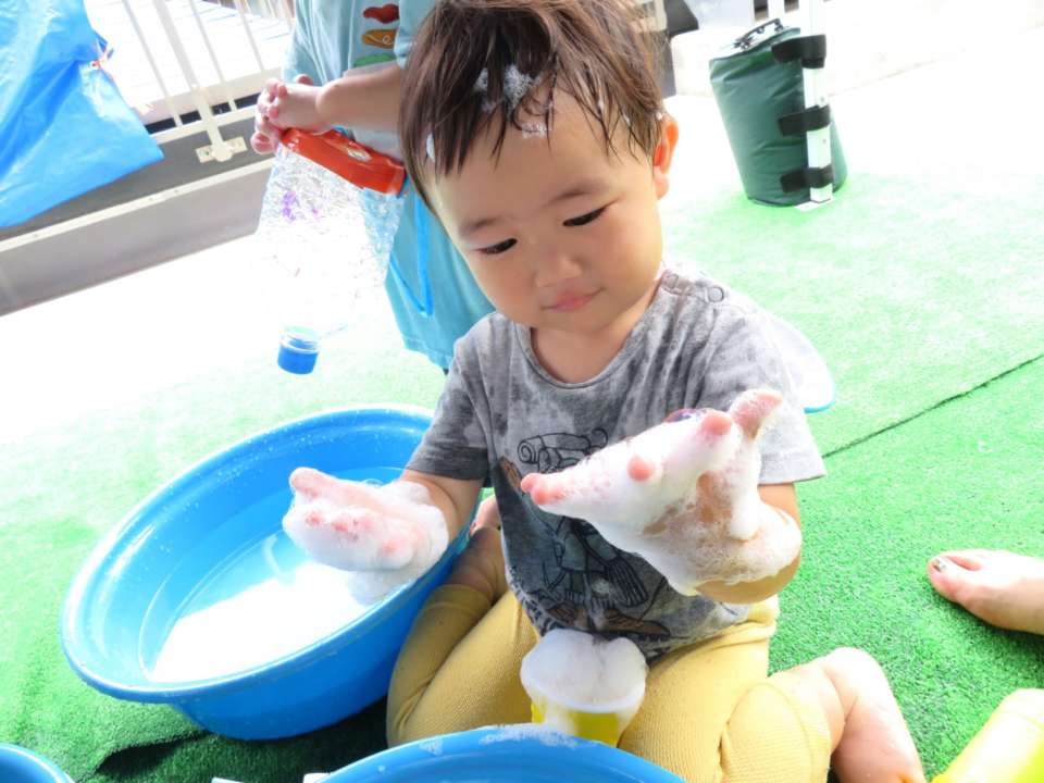 手にたくさん泡をつけて、石鹸遊びも楽しんでいます。
