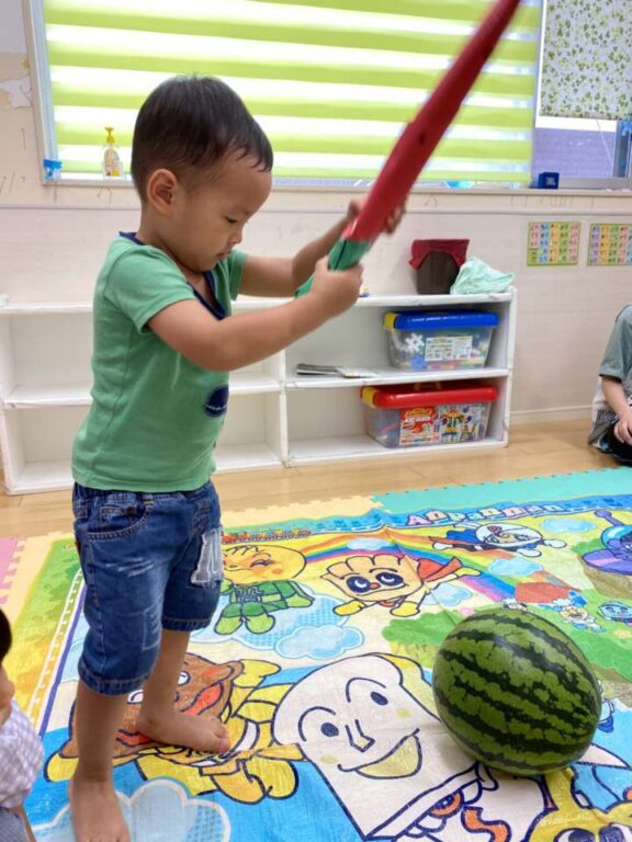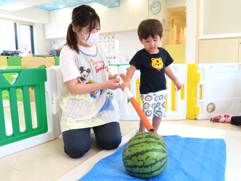 「がんばれー!」と声援を受けて、一生懸命すいかを叩いています!
