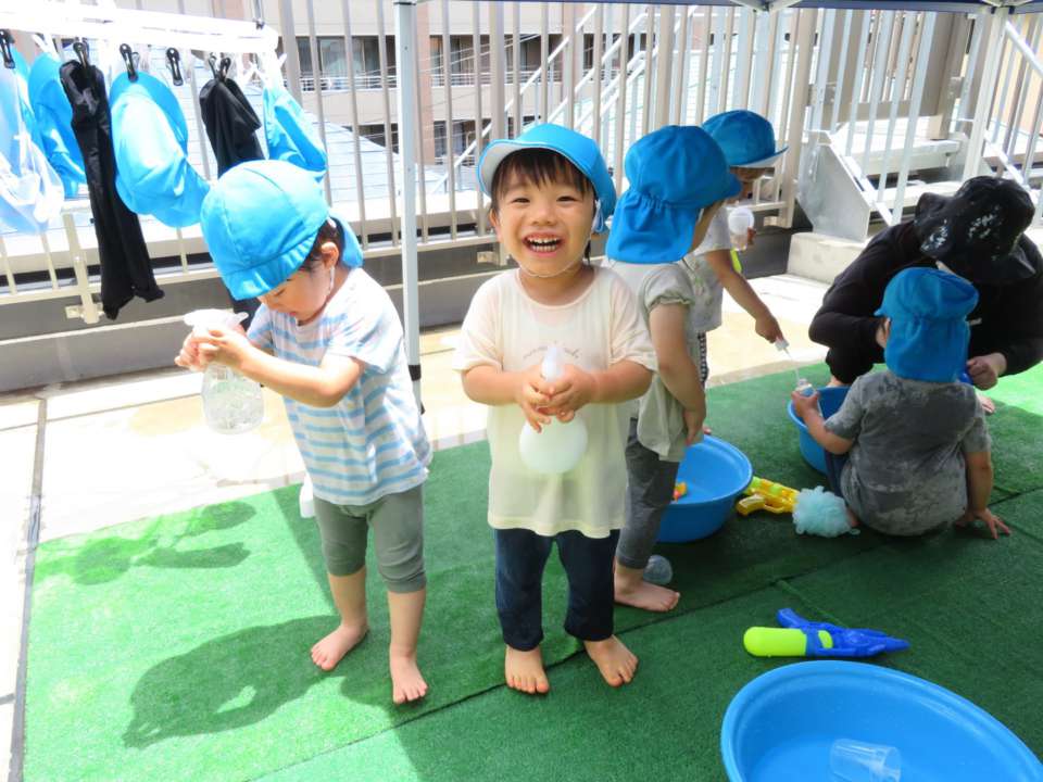 テラスに出るとすぐに霧吹きや水鉄砲で水を掛け合い、全身ビショビショになるまで楽しむ子ども達。
