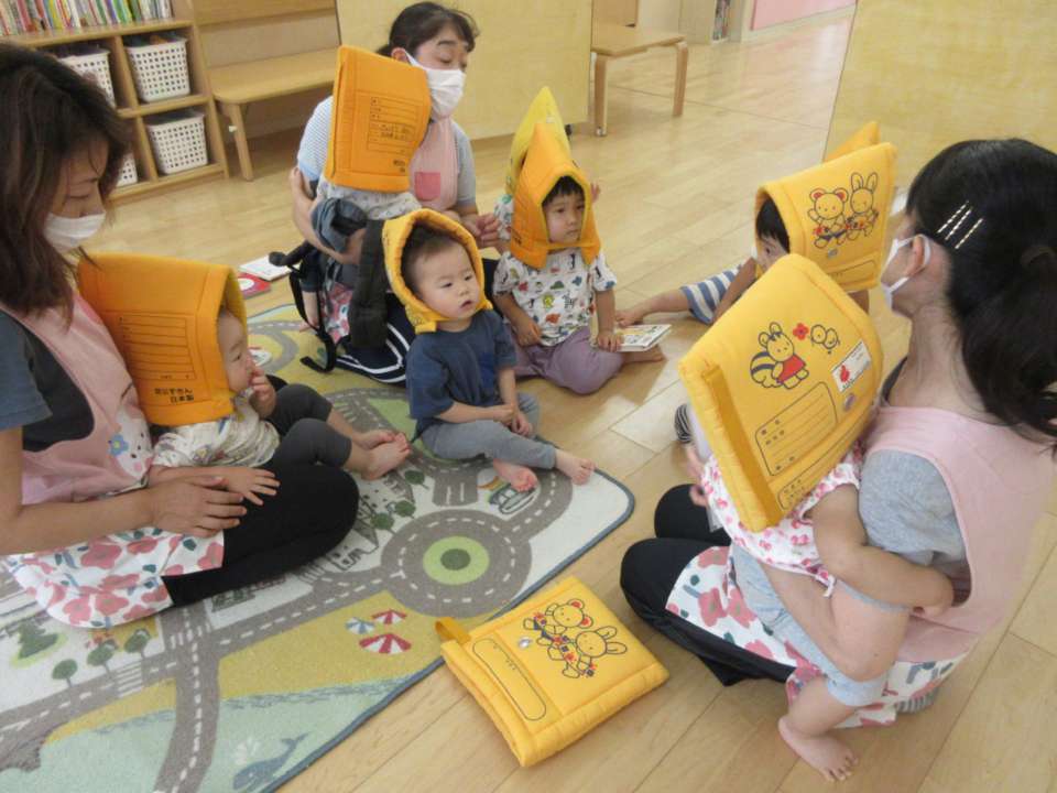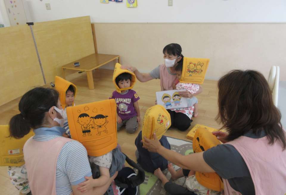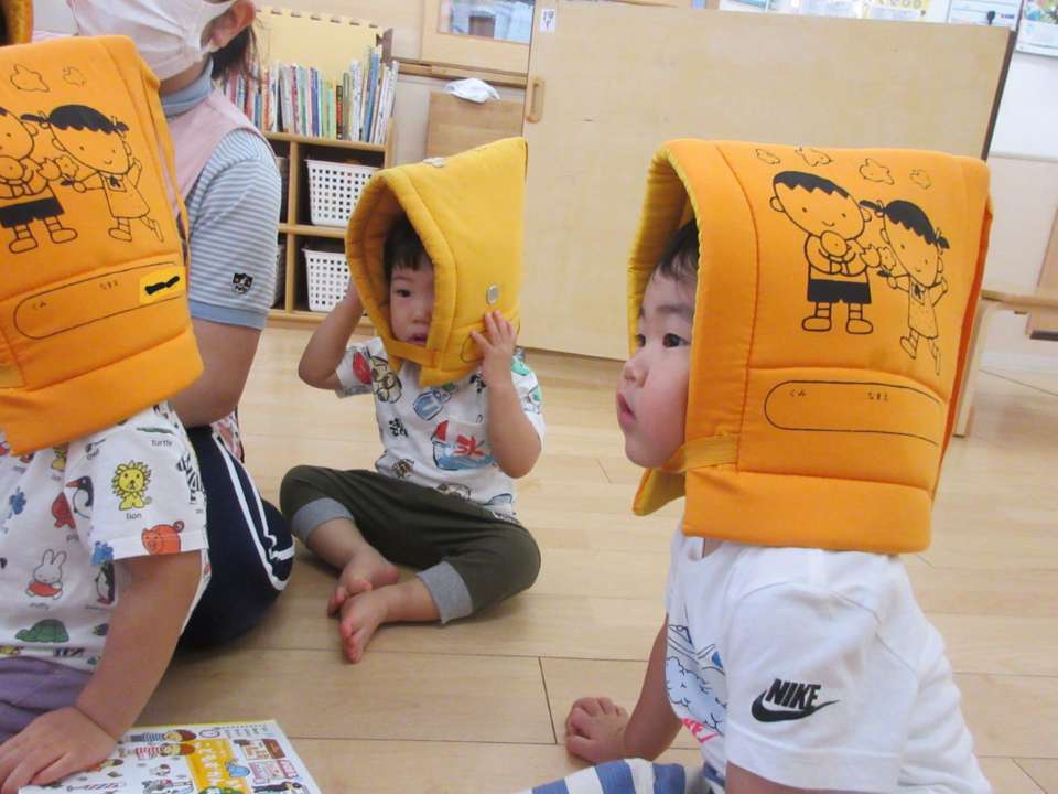 頭を守るための防災頭巾もしっかりかぶり、先生のお話も真剣に聞いてくれています。
