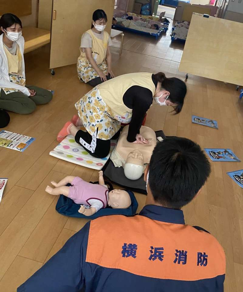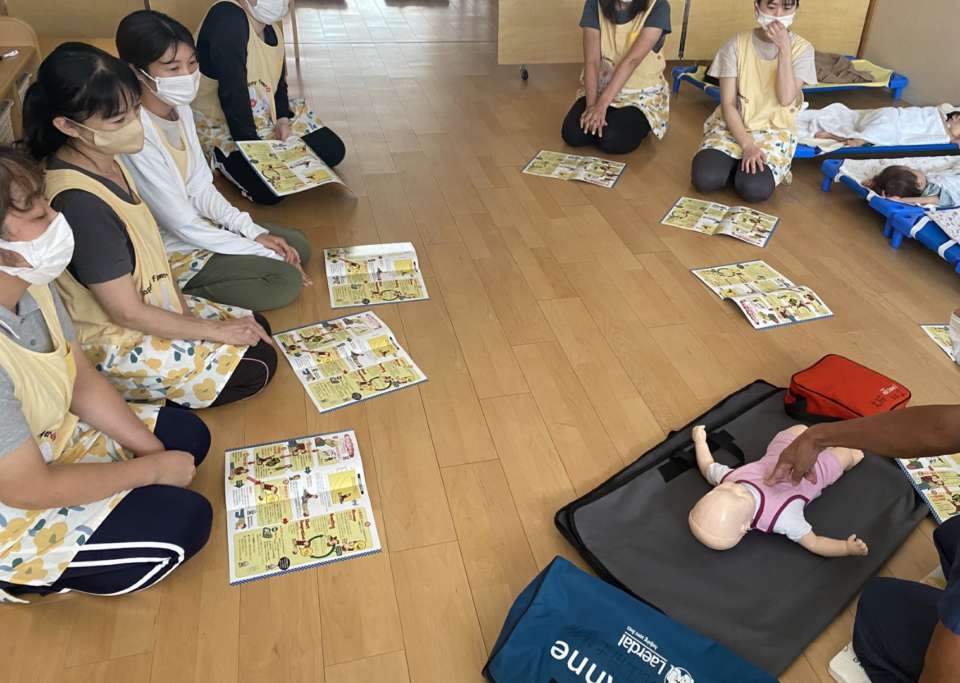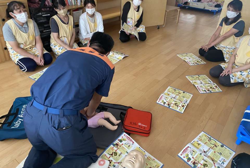 職員も消防署の方の指導のもとAEDや誤嚥の時の対処法などの講習を受けました。