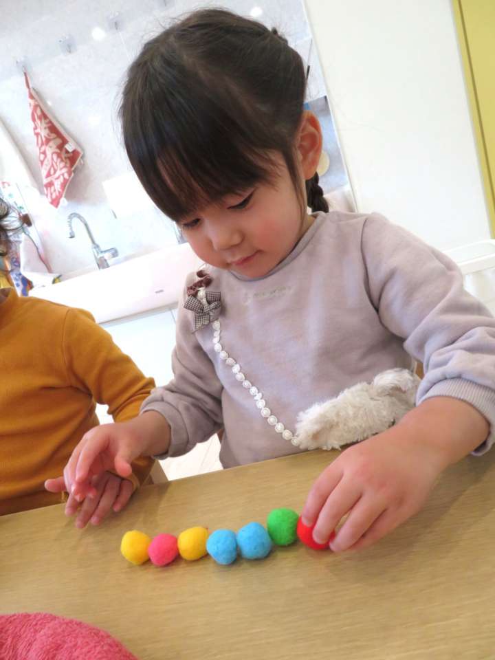 「1、2、3…」と数を数えながらポンポンボールを並べています。