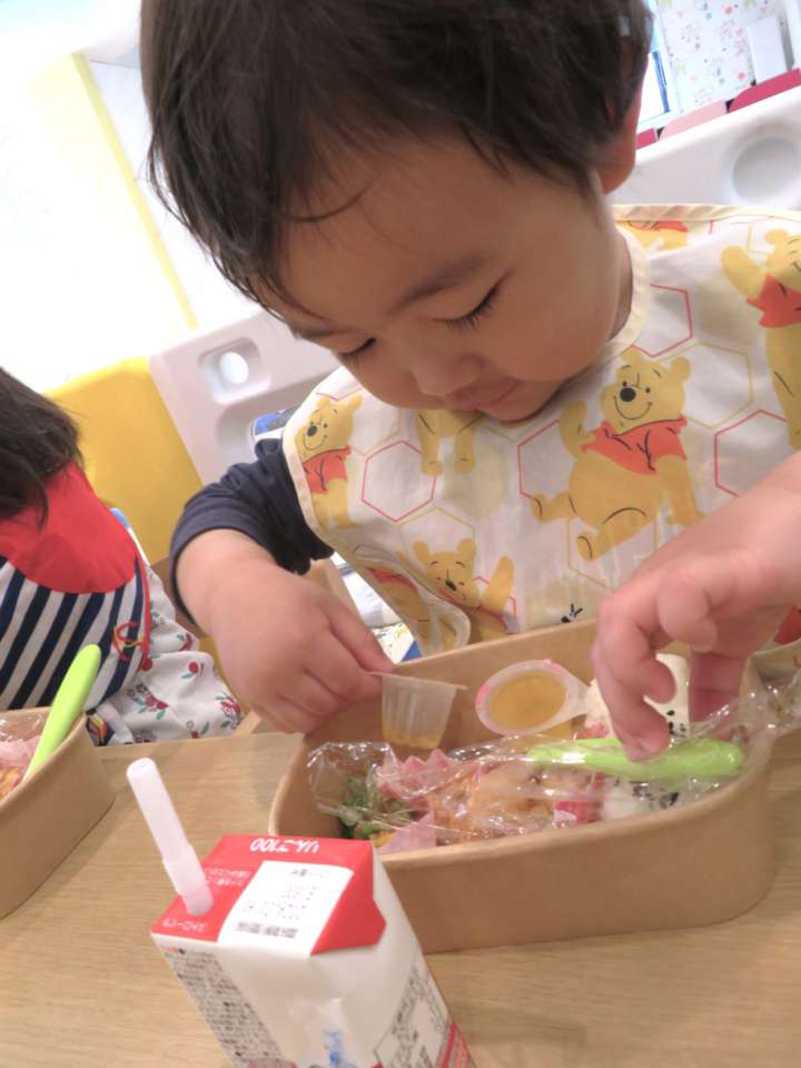 たくさん体を動かした後は給食の時間。この日は特別な「お弁当給食の日」です🍴✨