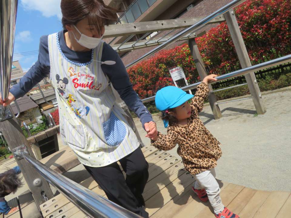 つり橋の遊具では、「先生、大丈夫?いっしょに渡ろう!」と手を引いてくれる頼もしい姿も見られました👀❕