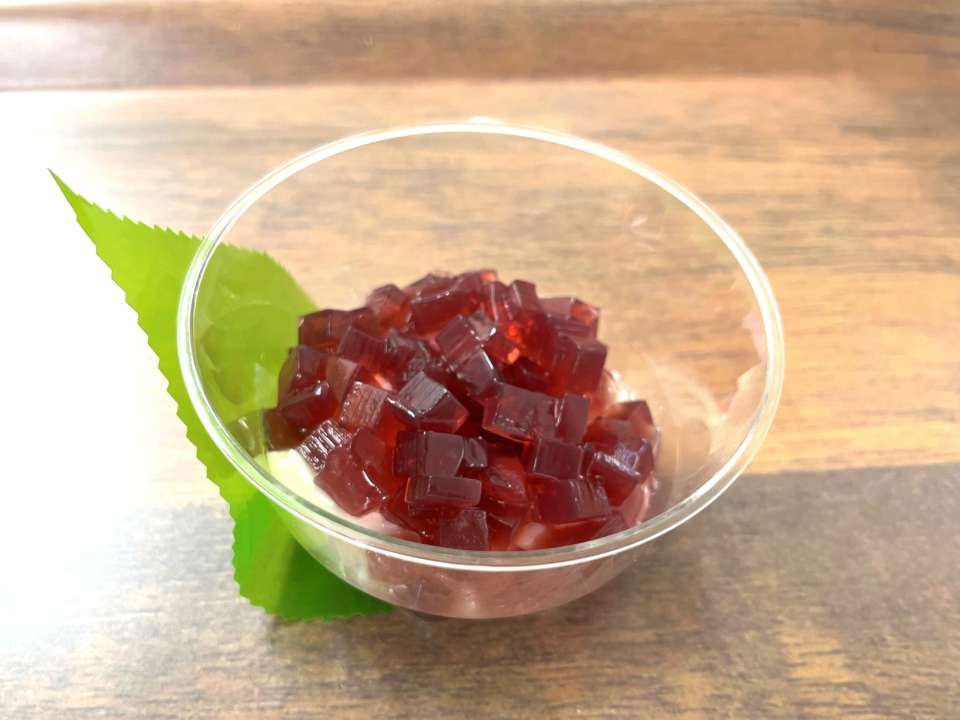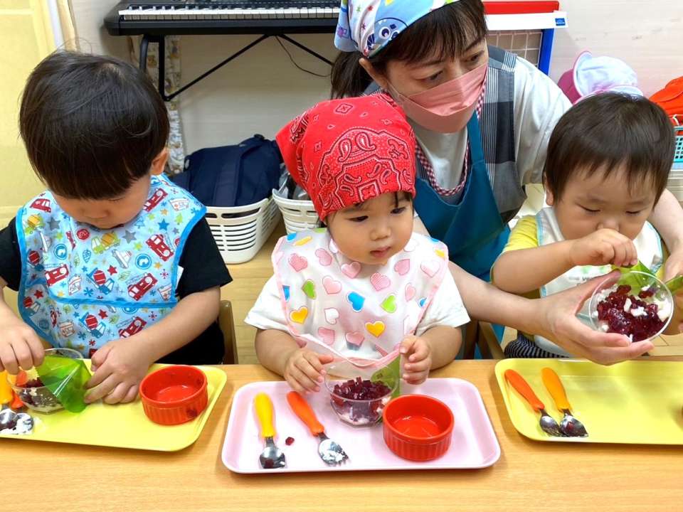さて、この日はいちご組さんと給食のデザートの「あじさいゼリー」の盛り付けをしました。