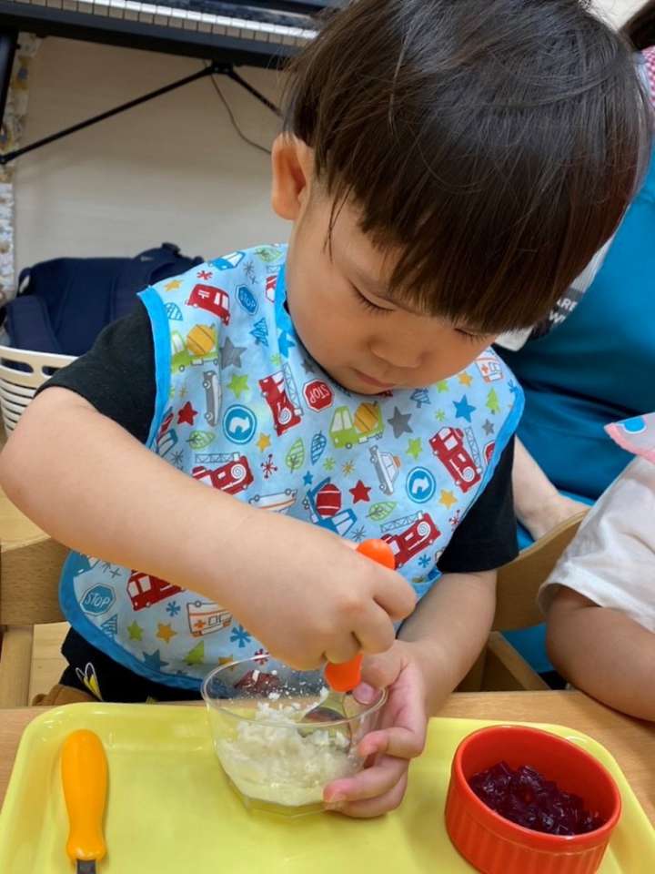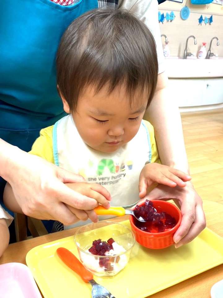 その上にスプーンでぶどうゼリーをのせていきます。みんなとっても上手!