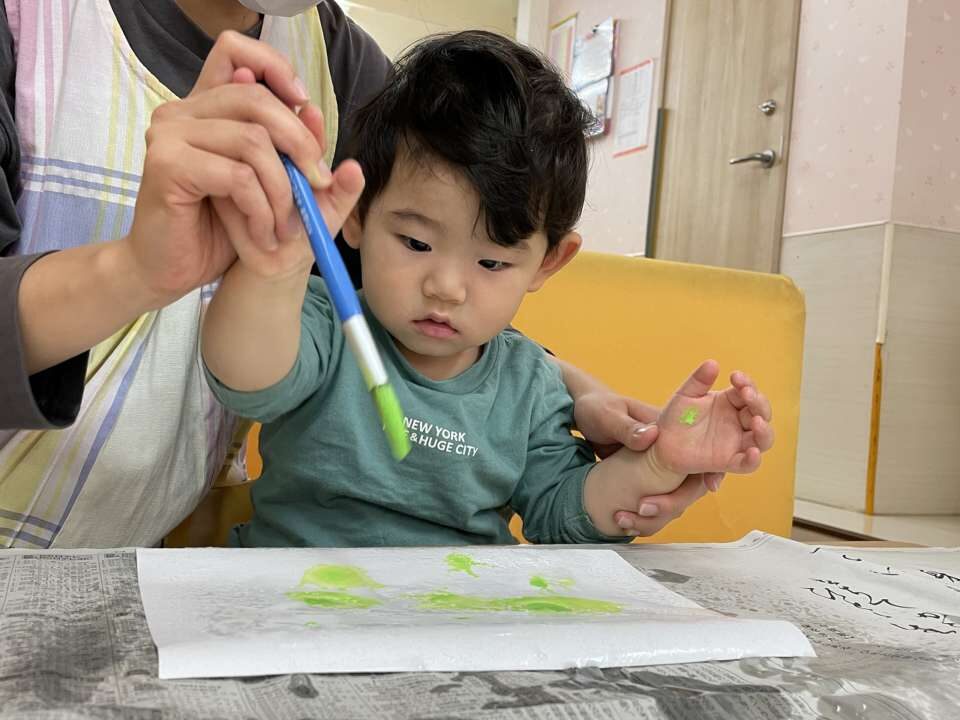*制作では、保育士と一緒に絵筆を使って絵の具を塗ることをしてみたり、ビー玉を転がして色を付けることに挑戦しました!