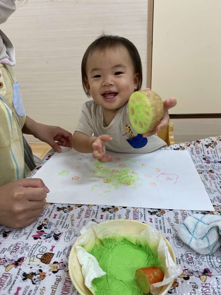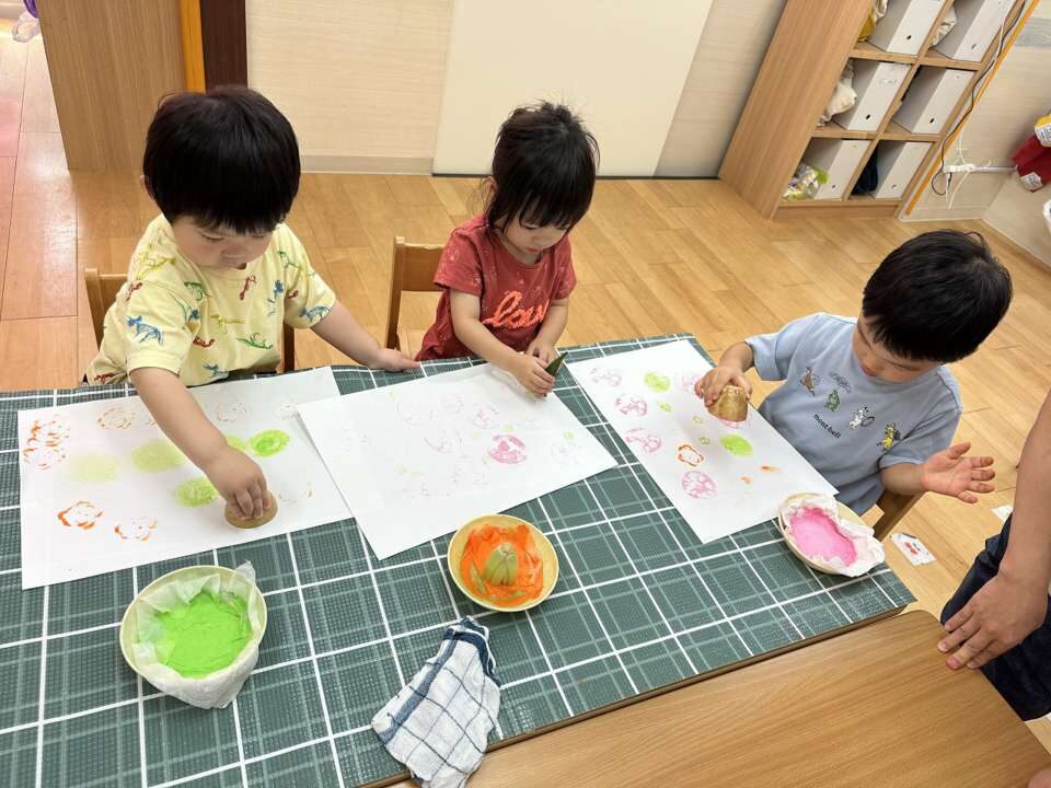 雨の日や暑すぎて水遊びできない日などは、野菜スタンプの制作もしました☆
