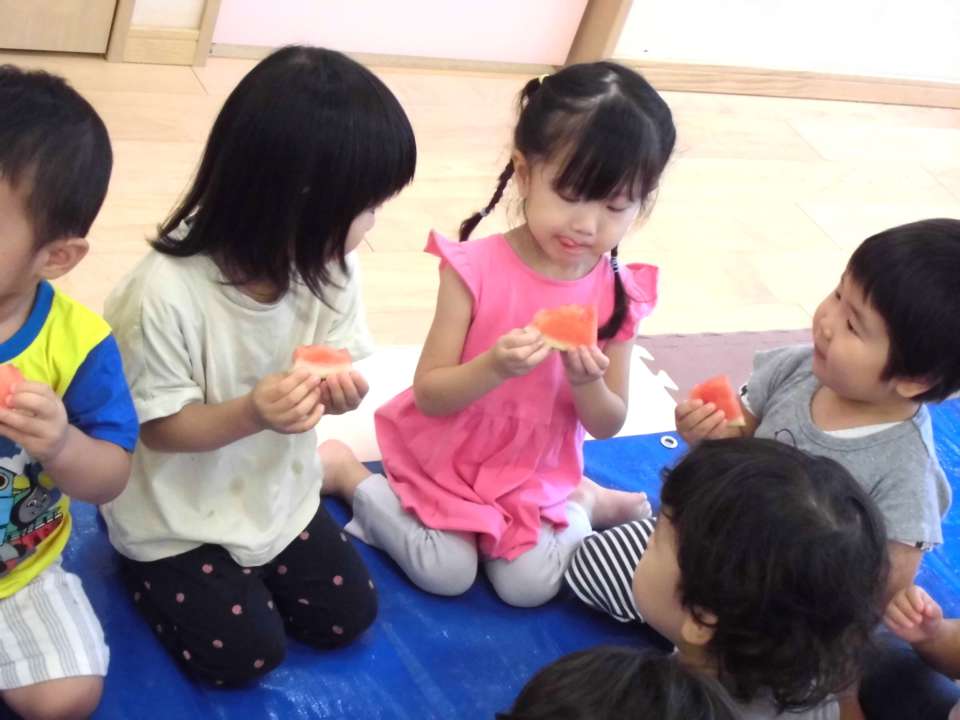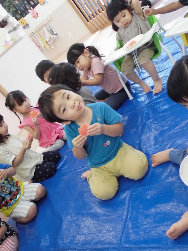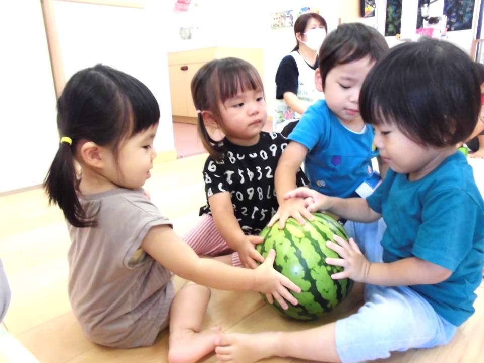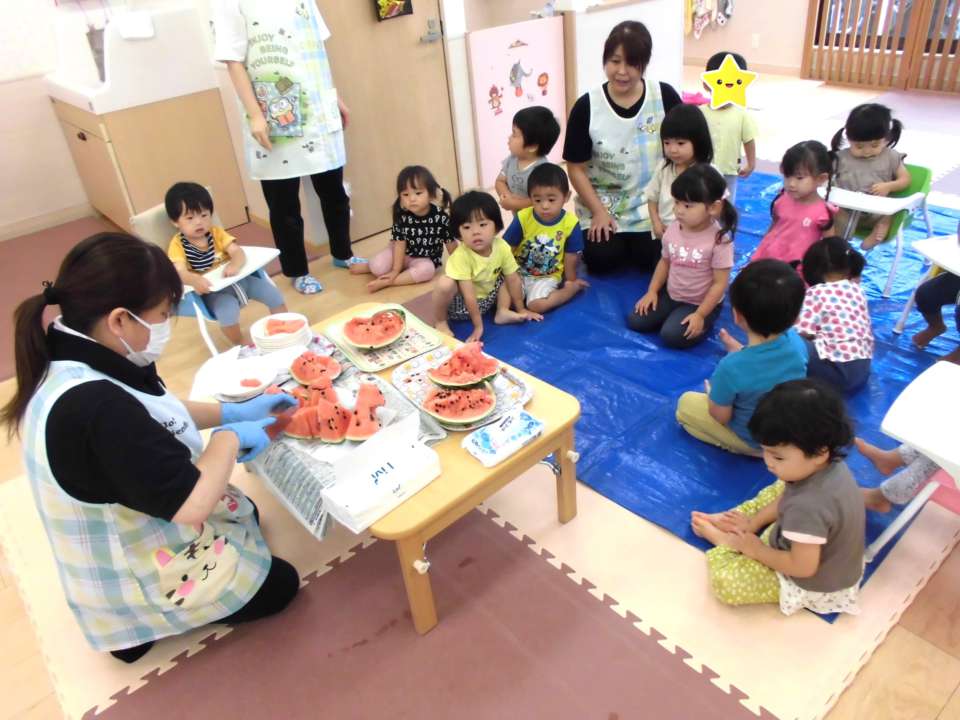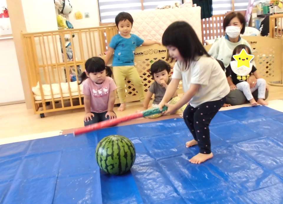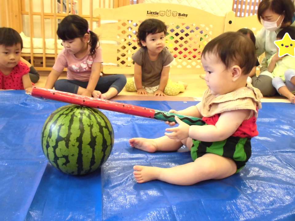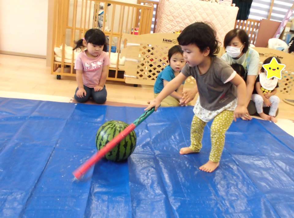 津田沼園では、ある夏の日にすいか割りを行いました。