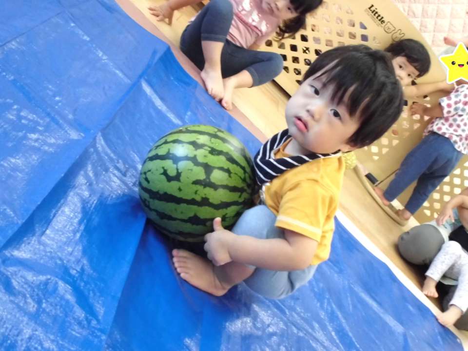大きなスイカ・・・なかなか割れず・・・先生に手伝ってもらってやっと割れました。