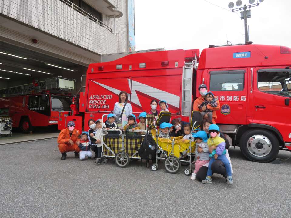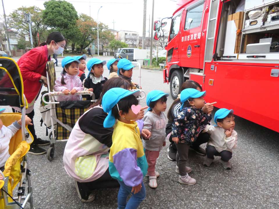 大きなはしご車を目の前に、緊張気味の子ども達…。消防士さんのお話を集中して聞いています🤫