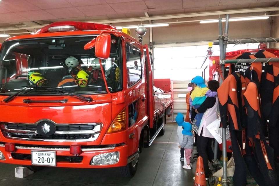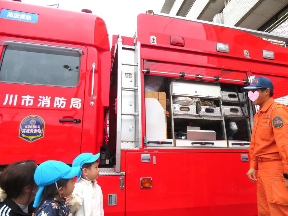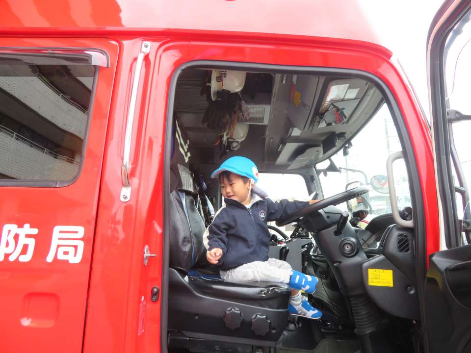 「消防車の中に黄色い縄跳びがあったね」「船がある!」と大きな声で話をしていました。