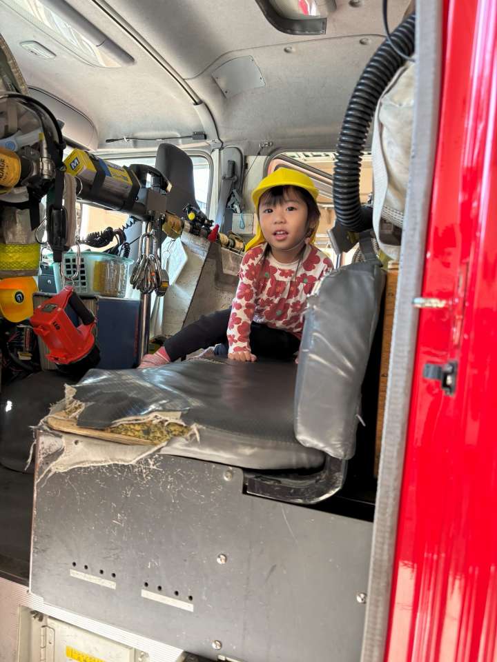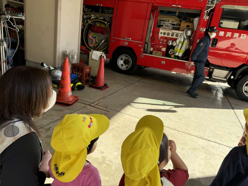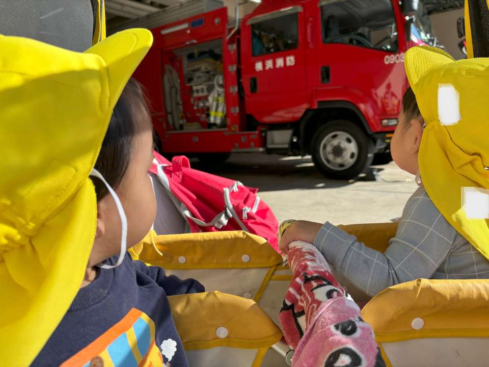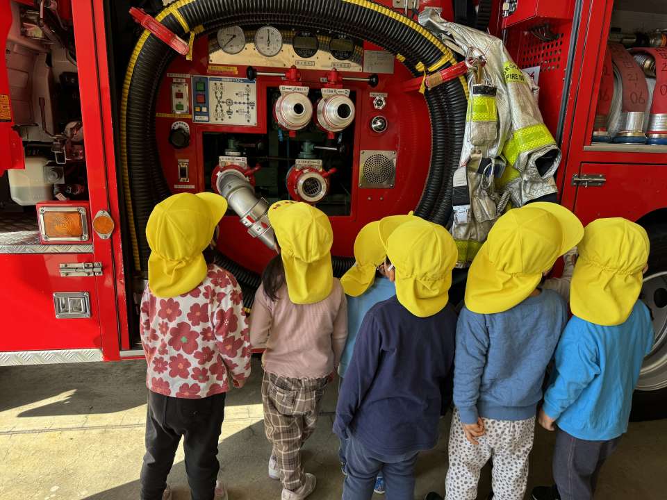 消防車は子どもたちと一緒に歩いても園から5分かからない位の距離です。
