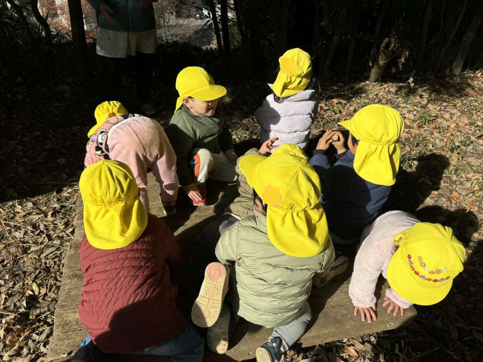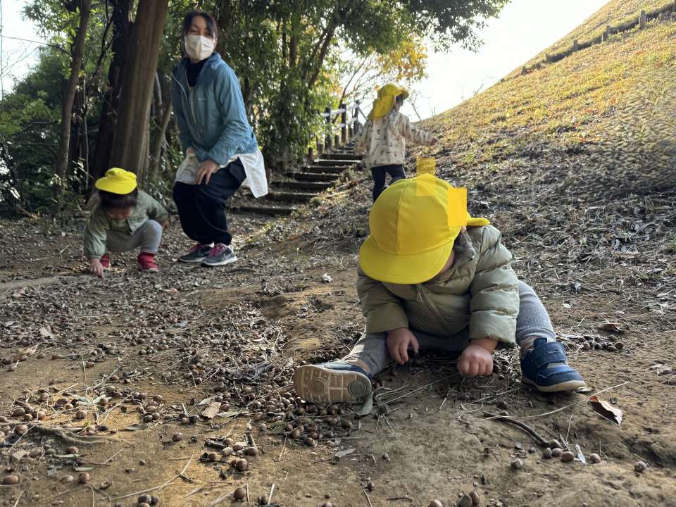 子どもたちはわくわくしながら落ち葉やどんぐりを集めています。